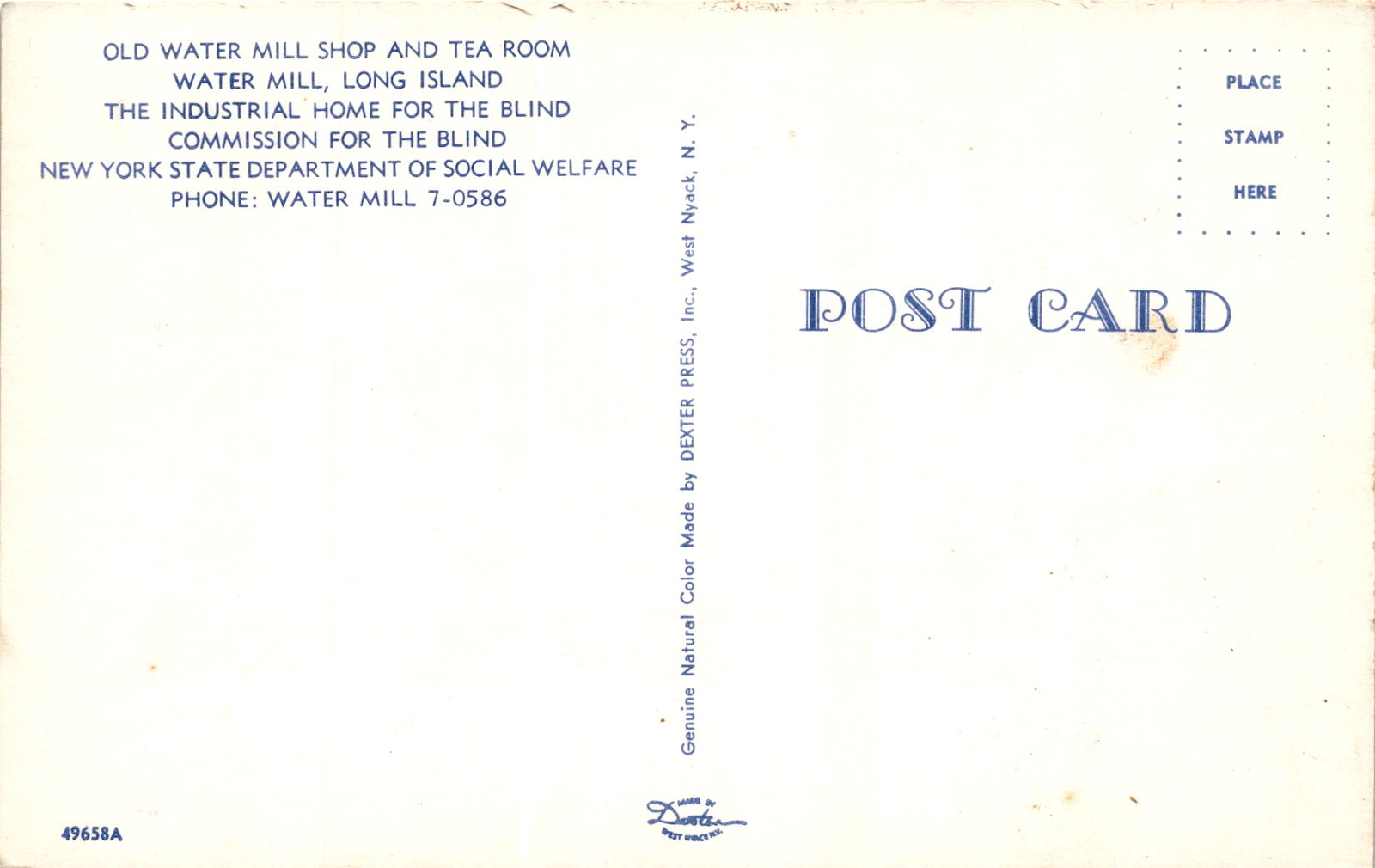 MAKE AN OFFER. THE MORE YOU BUY THE BETTER DEAL I WILL ACCEPT The postcard features an image of the Old Water Mill Shop and Tea Room located in Water Mill, Long Island. The establishment is associated with The Industrial Home for the Blind, which is part of the Commission for the Blind under the New York State Department of Social Welfare. The phone number for the shop is listed as WATER MILL 7-0586.