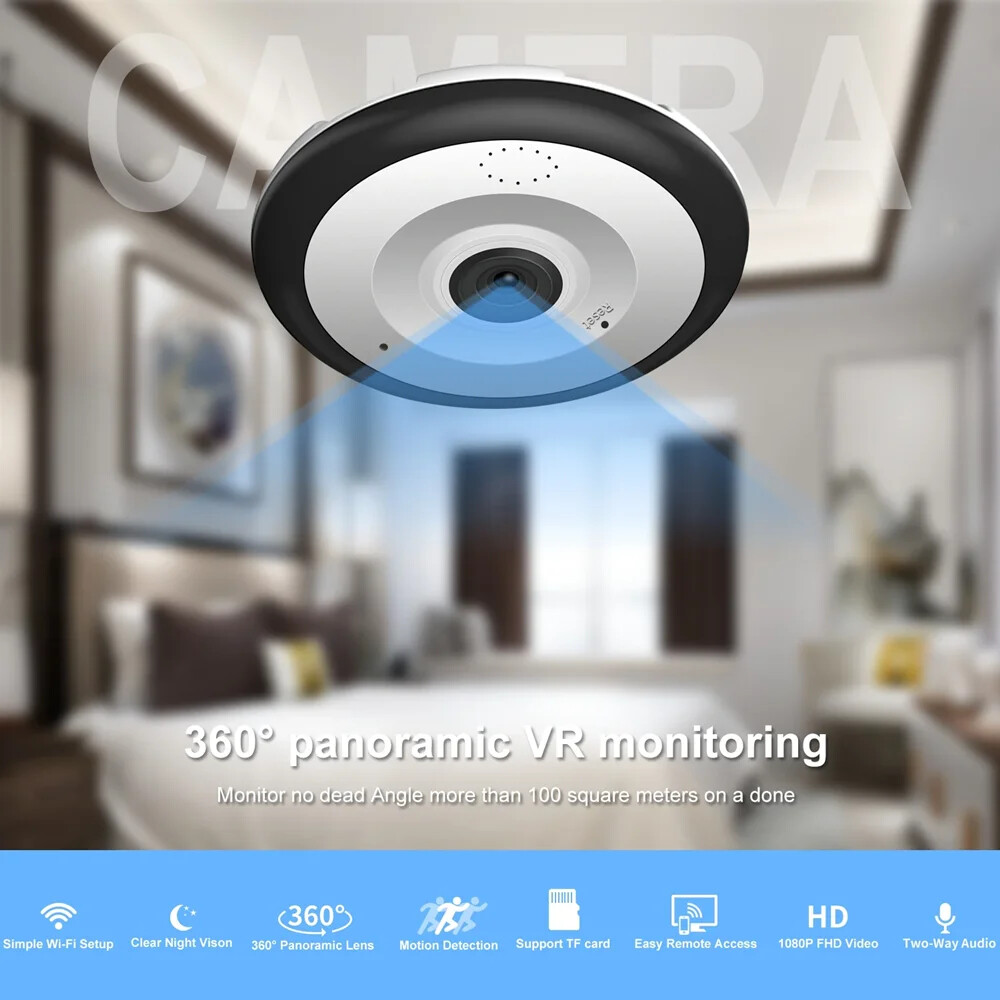 360 WIFI Camera Two Ways AUDIO Smart Home Security Protection MINI Surveillance Wireless Camera 5MP Features: APP:V380 Pro Chip:AK3918E Resolution:2.0MP (1920*1080P) Sensor Resolution:1.3MP 3MP 5MP Lens:Fisheye lens (1.35±3%mm) View angle:360° View angle:Horizontal: 185°/ Vertical:185° Video compression standard:H.265/20FPS Electronic shutter:Auto Backlight compensation:Support Noise reduction:2D、3D LED quantity:3pcs Infrared LED Network:WIFI wireless transmission (support IEEE802.11b/g/n wireless protocol). Suport AP hotspot Night vision IR-CUT switch Automatic,about 5-8meters (It varies from environment) Audio:"Built-in microphone and speaker, support two-way audio and real-time transmission. ADPCM audio compression standard, self-adapt to code stream" Storage:TF Card(Max 128G);Cloud storage /Cloud disk (optional) Power input:5V/1.5A (US and EU plug optional) Work environment:Working temperature:-10℃ ~ + 50℃ Working Humidity: ≤95%RH 360 WIFI Camera Two Ways AUDIO Smart Home Security Protection MINI Surveillance Wireless Camera 5MP V380 Pro APP For Cellphone: Packing List: 1 * 360 Panoramic WIFI Camera 1 * Power Supply 1 * Screw Package 1* Manual