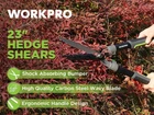 [ IDEAL HEDGE SHEARS ] - 23" hedge shears equipped with steel wavy blade, egonomics handle and shock absorbing bumper, is ideal garden tool for pruning tasks like making high or hard-to-reach cuts, trimming flower stems, maintaining your herb garden, and more to encourage overall plant health. [ CLEAN, EFFORTLESS CUTS ] - The steel wavy blades with low-friction coating are heat-treated and contoured for clean, effortless cuts that prevent branches from slipping off. Your bushes and trees will keep healthy and attractive with clean, smooth cuts! [ LABOR-SAVING DESIGN ] - The 14°ergonomic angle of our bush cutter reduces work impact, minimizes wrist fatigue, and prevents bending while trimming. Position the shears blade-up for flat cuts and flip them for circular or arc cuts. Elevate your trimming game with our user-friendly design. [ SHOCK ABSORBING BUMPER ] - Incorporating a shock-absorbing bumper for responsive and comfortable stops, our garden hedge trimmer minimizes impact force during tough bush cuts. This feature reduces wrist and shoulder pain, enhancing overall comfort and control during operation. [ ERGONOMIC HANDLES ] - Ergonomic handle with non slip grip of our precision bush shears ensure a secure grip in any position, providing durability and comfort for all your gardening tasks. With WORKPRO Garden Clippers, every cut becomes a joy, and your shrubs thrive! anufacturer HANGZHOU GREATSTAR INDUSTRIAL CO.,LTD Part Number 23" hedge shear Item Weight 3.57 pounds Package Dimensions 24.65 x 8.46 x 2.56 inches Country of Origin China Item model number 23" hedge shear WORKPRO HEAVY DUTY HEDGE SHEARS SHOW DETAILS Steel Wavy Blade Keep the cut in the cutting area of the shears and do not slip. Shock Absorbing Design Reduce noise and vibration during operation. Efficeient Cut-14° Bevel This design helps users maintain a comfortable and efficient posture using the hedges shears. Ergonomics Handle Soft grip enhance comfort and control, and reduce fatigue at work. MULTIFUNCTIONAL GARDEN PRUNERS