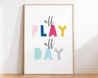 Wall Art For Kids Room Decor All Play All Day Print Nursery Wall Decor Printable Poster Children Playroom Decor Signs Material: Premium luster photo paper Print type: Inkjet printing One side printed + The finish provides the highest possible resolution and color saturation + Lasts up to 200 years in color and 400 years in black-and-white + Printed on high-quality resin-coated photo base paper medium + Posters can be hung with double-sided tape, tacks, or framed + Hand washing with a gentle cry cloth is recommended for extended durability I will hand select the best choice of paper for your chosen design to ensure top quality results for a beautiful, bright and luxurious print. All prints are sealed in cellophane slips for protection during transportation, and are shipped in a protective cardboard envelope.