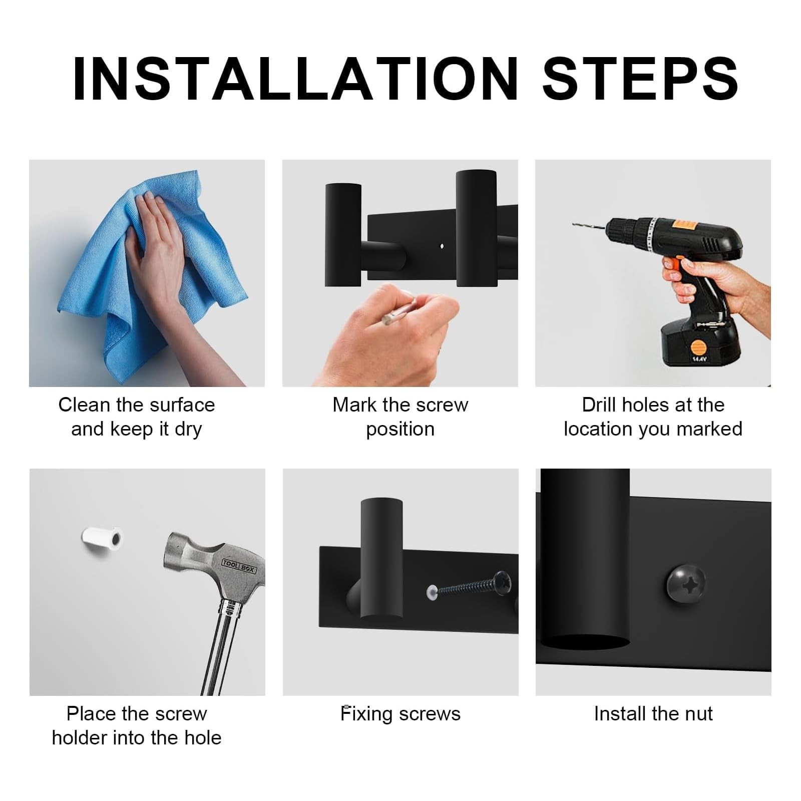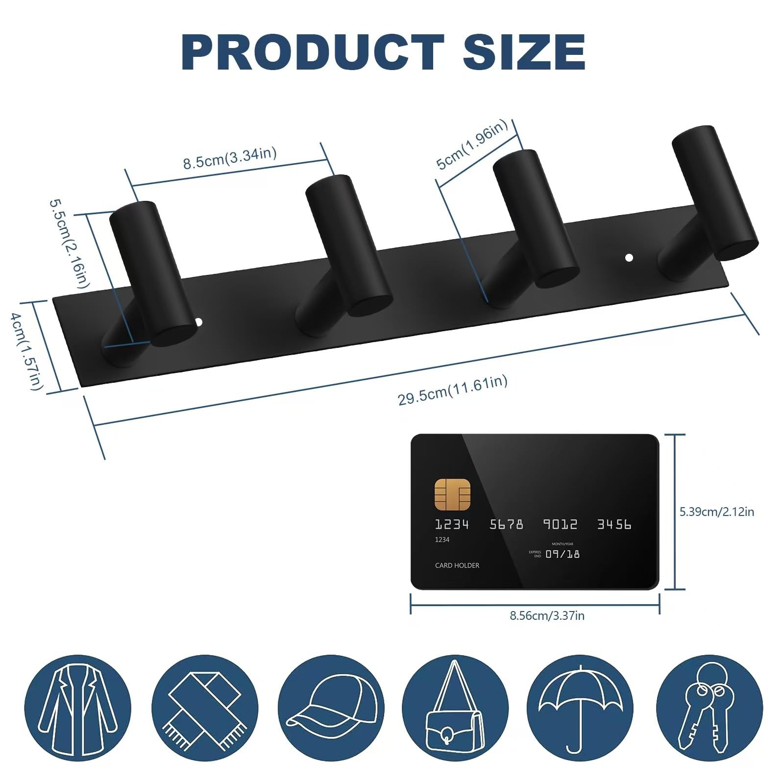 Tired of the daily chaos? Meet the Coat Rack Wall Mount, your ultimate organizer! Crafted with sturdy materials to handle your everyday needs, this rack keeps everything within easy reach while maintaining a sleek look. Key Features: - Versatile Use: Whether in the kitchen, bathroom, or entryway, this hook rack has got you covered. Hang towels, robes, bath essentials, keys, masks, hats, bags, jackets, and more effortlessly. - Enhanced Hook Design: We've increased the hook spacing to provide better airflow and prevent moisture buildup. Say goodbye to moldy towels and hello to freshness. - Bathroom Bliss: Achieve bathroom organization bliss with this rack. Neatly store bath towels, robes, and other essentials with the perfect hook distance to keep things. - Efficient Entryway Storage: Two rows of hooks mean double the storage. Suitable for your keys, face masks, hats, pet leashes, backpacks, bags, umbrellas, jackets, and more. Keep your entryway tidy and clutter-free. Product Information: - Material: Stainless Steel - Color: Black - Dimensions: 11.6*1.57*1.96inches Installation Steps: 1. Choose your desired location and mark it with a pen. 2. Indicate the punching positions. 3. Use a 6mm drill to create holes. 4. Securely fasten and screw in the screws. Bring order to your life with the Coat Rack Wall Mount. Simplify, organize, and make everyday tasks a breeze! Dimensions:11.8x1.57x1.96 inches VERSATILE USE:This Black Row Hook Coat Rack with 4 Hooks is good for various locations, including bathrooms, kitchens, living rooms, entrances, and offices. Use it to hang towels, kitchenware, coats, hats, jackets, wallets, keys, and more, adding functionality and organization to your space EASY INSTALLATION:Mounting this wall hat rack is a breeze, whether on a wall or wooden door. It includes all necessary mounting hardware, ensuring a hassle-free installation process EXCLUSIVE ORIGINAL DESIGN:This rack comes with 4 modern-style wall hooks in our original design, protected by patent (29939860) ANTI SLIP AND SCRATCH RESISTANT:Each hook features thoughtful protrusions to prevent clothes and hats from slipping, and its smooth surface won't scratch towels, jackets, or coats OPTIMIZED HOOK SPACING:The row hook spacing is designed for efficient ventilation and drainage. The coat hook configuration is upgraded to accommodate smaller items effectively