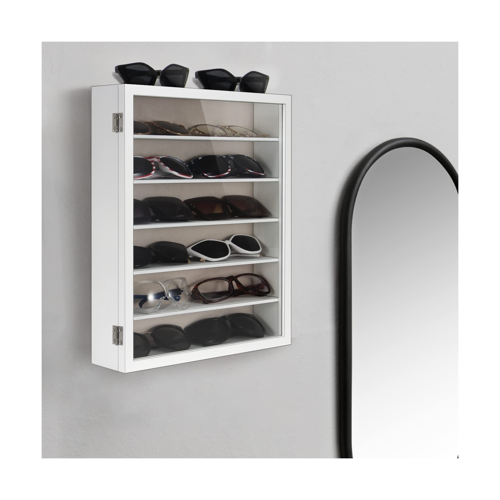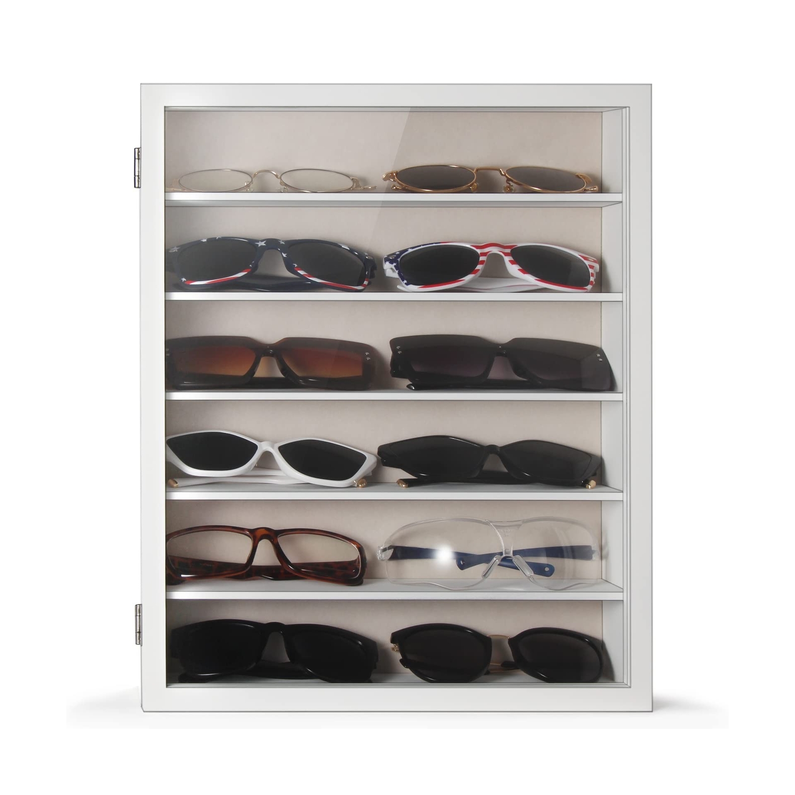 Brand New Sunglasses Organizer Storage Wall Mounted: 13 x 15.6 inches Eyewear Display Case Rustic Wood Eyeglasses Holder Large Glasses Storage Box,White Manufacturer model: 8631 Sunglasses always fall off, and they get scratched, and they break. Worst of all, this seems to happen whether theyre on the desk, hung on a shirt or stashed in a pocket. Luckily, this the best sunglass holder box can help. 6 layers of wood panel design, you can put 12-14 pairs of sunglasses. This eyeglasses storage box is great if you want to be able see your glasses but still want to keep them protected from dust. Clear glass front gives you a open view and you can find your favorite treasure in seconds with this unique glasses display case The magnetic door of this sunglasses organizer is very convenient to open and close, and prevents the items inside from falling out, allowing you easily update your display as often as you want. Internal size: 12.2"L x 2.25"H x 2.5" D, External size: 15.6"L x 13"W. And it has two hooks on the back for easy wall mounting. Each shelf has enough space to accommodate normal sunglass, cycling glasses, reading glasses, and sports sunglasses. Suitable for family and business use. Description Shipping and Handling Please allow 5-7 business days for the package to arrive, regardless of buyer location within the US. We will provide an online tracking number to you once the item has been shipped. It may take a few business days for our automated system to process the tracking number onto eBay. However, this will not affect the shipping times. Return Policy All our products are brand new and sealed. All items qualify for returns within 30 days of receipt. Feedback We take our reputation seriously. If you have any questions or concerns, please contact us and we will respond back to your message within 24 hours.