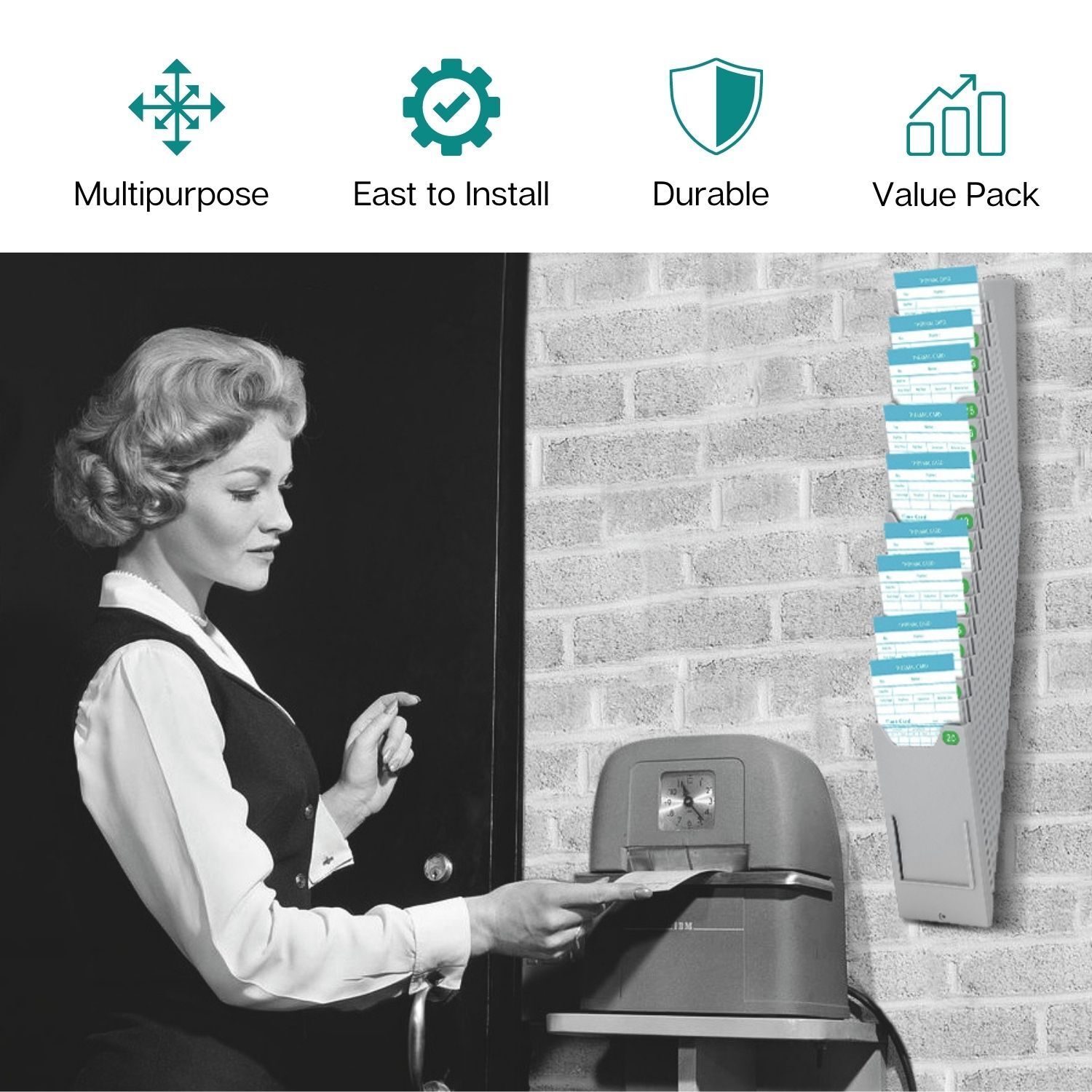 Flexzion Time Card Holder Wall Mount Time Card Rack 20 Pocket Expandable Single Row Timecard Holder for 7" inch Time Cards Clock Cards Employee Time Card Attendance Time In Time Out, Gray Flexzion Time Card Holder Wall Mount Time Card Rack 20 Pocket Expandable Single Row Timecard Holder for 7" inch Time Cards Clock Cards Employee Time Card Attendance Time In Time Out, Gray Introduction: Organize employee badges or swipe cards in entry or exit areas for visual time and attendance monitoring with this time card holder. The expandable double-row time card rack offers 20 pockets and can be lengthened or shortened based on usage to suit your needs. This time rack holder has mounting tools to easily mount to a wall or combine with other slots. Excess time card pockets can be removed to fit your company size. Made of high-quality material, durable plastic construction resists damage. It maintains an attractive appearance in even the harshest environments, making it ideal for indoor and outdoor use. A sticker sheet is provided to customize slots to specific needs. Expands by combining racks or contracts by removing pockets. Feature: Easy Visual Monitoring - Track employees’ arrival and departure times, lunch breaks, and overtime. Keep records organized and accessible, thanks to this high-quality time card rack. High-Capacity Time Card Rack - Holds up to 20 standard 11.7 cm wide cards. Maintain a physical record for every employee with ease and maximize office efficiency. Convenient and Dependable - With its expandable modular design, pockets may be added or removed to accommodate your needs. This time card rack is straightforward and simple to use and store. High-Quality Materials - Constructed of lightweight but durable plastic. Rust-free and impact-resistant to ensure nothing is lost in a disaster. Perfect for indoor and outdoor use. Simple Installation - Comes with mounting hardware. Install this time card rack near the time clock or the employee entrance for convenience. Note: Time Cards are not included. Specification: Color: Gray Material: Plastic Card slot depth: 17cm Rack dimensions: L x W x T: 69 x 12.5 x 4.5 cm (27 x 4.9 x 1.7 inches) Compatible with: 18 x 11.7 cm (7 x 4.6 inches) Card Package Content: 1x Time Card Rack 20 Pocket Slots Wall Mounted Expandable Single Row Time Card Holder Compatible with 7" Clock Cards Pyramid Series 2000 6000 Employee Attendance Clock In Clock Out, Gray