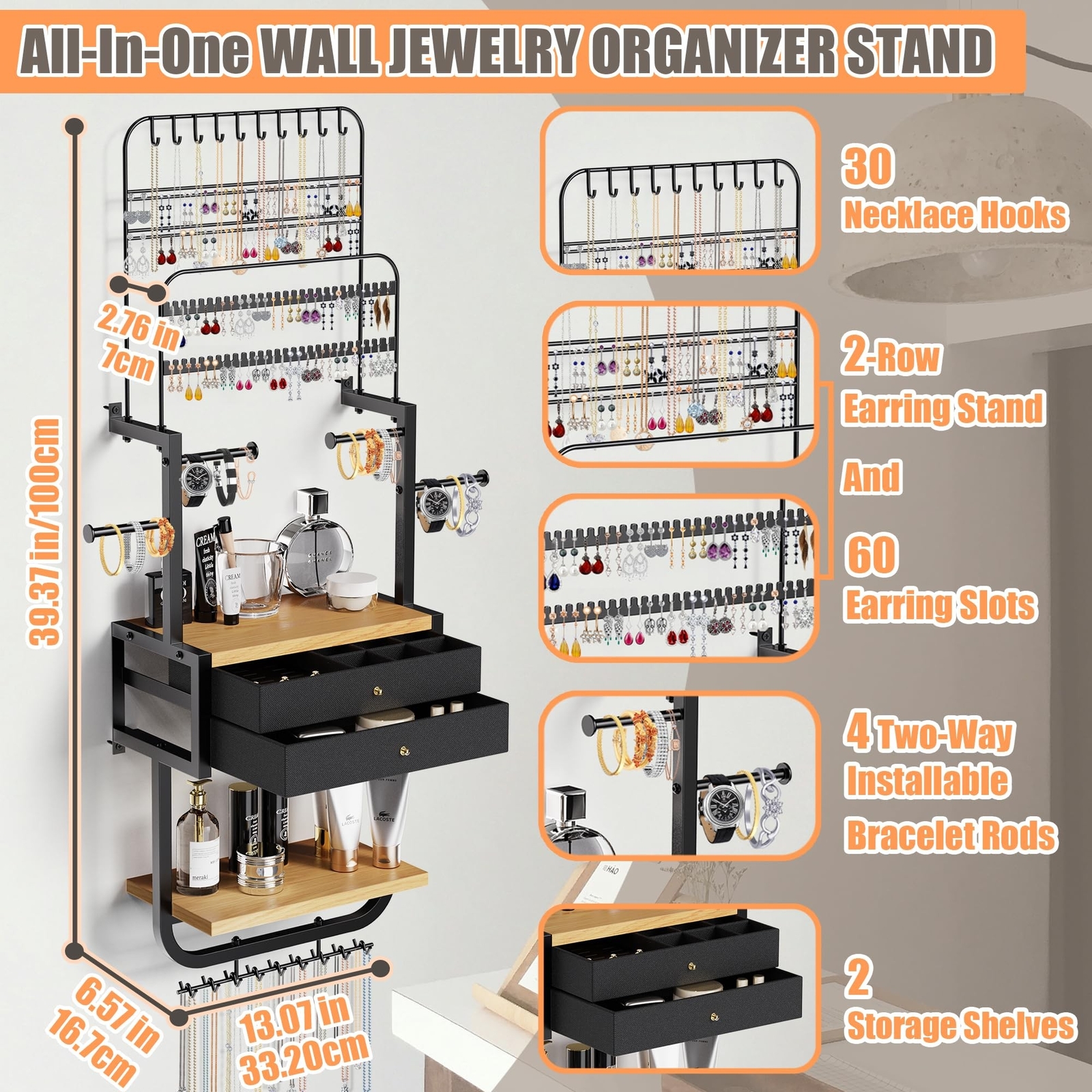 Wall Mounted Jewelry Organizer, Large Jewelry Organizer and Storage, Wall Hanging Jewelry Organizer for Earring, Necklace, Bracelet, Perfume (BLACK) Product Details Color: BLACK Brand: BEGULF MPN: BE003 UPC: Does not apply EAN: Does not apply Color: BLACK Brand: BEGULF Material: Metal Style: Modern Special Feature: Secret Compartment Recommended Uses For Product: Necklace, Ring Product Dimensions: 6.57"D x 13.07"W x 39.37"H Target Audience: Women Shape: Square Occasion: Mother's Day Color: BLACK Brand: BEGULF Material: Metal Style: Modern Special Feature: Secret Compartment Recommended Uses For Product: Necklace, Ring Product Dimensions: 6.57"D x 13.07"W x 39.37"H Target Audience: Women Shape: Square Occasion: Mother's Day Mounting Type: Wall Mount Finish Type: Polished Inner Material: Metal Number of Drawers: 2 Item Weight: 3.3 Kilograms Number of Compartments: 2 Jewelry Storage Type: Jewelry Stand Number of Items: 1 Manufacturer: BEGULF Part Number: BE003 Item Weight: 7.26 pounds Country of Origin: China Item model number: BF0003 Finish: Polished Item Package Quantity: 1 Special Features: Secret Compartment Included Components: Metal, Wood Batteries Required?: No Date First Available: May 20, 2024 Multifunctional jewelry holder Stylish way for storing and displaying different items.This wall jewelry organizer combines earring organization, necklace stand, bracelet organizer and jewelry drawers. Greater improvement in space utilization. Sturdy and Durable The sturdy metal frame allows this jewelry display hanger to remain stable even when storing lots of jewelry. It can be used to store your cosmetics or daily accessories as well as display jewelry. Large Capacity Large jewelry organizers and storage has 30 necklace hooks, 4 rows of earring racks, 4 bracelet racks, 2 independent storage shelves and two jewelry storage drawers, providing large storage choices. Perfect Gift Idea Hanging jewelry storage organizer is a perfect gift for your daughter, girlfriend, wife, or mother for Valentine's Day, Mother's Day, birthdays, Christmas, and many other holidays. Easy to Install With required hardware and clearly instruction for quickly. (Warm tips: we have attached the installation manual in the package.)