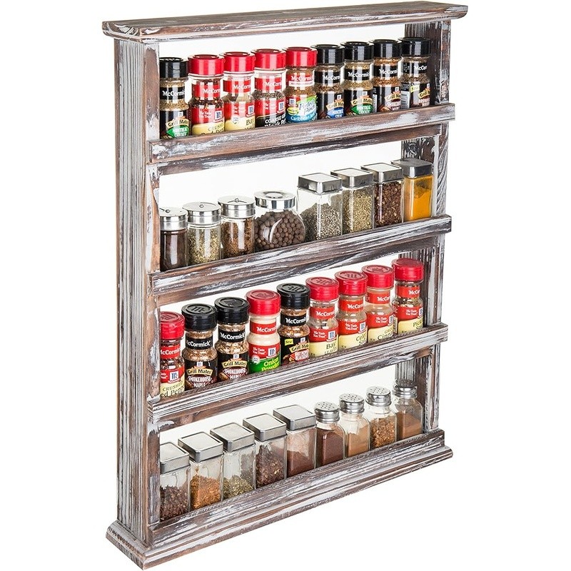 About this item Wall-mounted torched wood spice and condiment organizer with weathered whitewash finish Provides convenient storage for a complete assortment of spices in a compact space Each shelf allows spices to be securely stored yet easily viewed and removed as needed Torched-wood finish and simple traditional design add rustic vintage charm to country-themed decors Approximate Dimensions: Overall - 20.8 L x 3.3 W x 25.2 H; Between Shelves - 5.4 H (in inches) Material: Wood Color: Torched Wood Product Dimensions: 3.3"D x 21"W x 25.2"H Shelf Type: tier Number of Shelves: 4