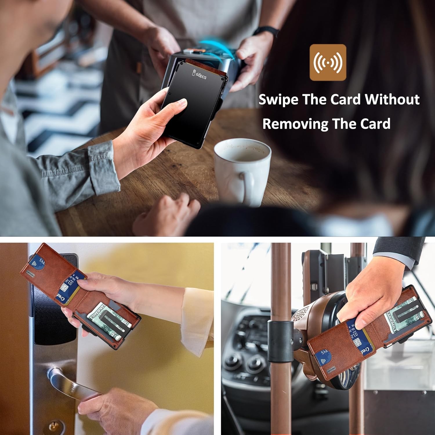 Wallet for Men - with Money Clip Slim Leather Slots Credit Card Holder RFID Blocking Bifold Minimalist Wallet (Top Layer Leather-Brown Red) 【Newly Design】: High quality top layer leather that is made for the cover of the wallet was treated to be water-resistant. The aluminum wallet chamber make of premium metal with a smooth eject pop up feature, using the latest ergonomic design, easy slide the side button of the metal wallet and get the neat pop-up cards. Inner magnet in the leather cover allowing you to attach the cover and the chamber magnetically. 【Enough Space】: 12 Cards can be inseted in this lightweight and compact aluminum wallet, with 3-4 additional cards (1 ID windows included) in the PU cover, another 6 cards can be stored in the aluminum champer of the wallet, 1 or 2 cards can be inserted in outside of the aluminum champer. 【Slim & Practial】: On the inside of the minimalist wallet, we have designed an ID Card Holder slot, which allows you to swipe the card without removing the card. It can be used to install ID card, work card, access card, traffic card, etc. use. A Metal clip was designed for carrying cash, 2 holes was designed on both side of the wallet to connect lanyard to bulit a double protection for your wallet. 【RFID Blocking】: Built in RFID chip will shield your credit cards debit card, and driving license from unknown scanning device, to protect your private property at most. 【Best Present】: This designed wallet is unisex, which was also deliveried with a beautiful package. It is the best choice for popular slim wallets for women and men. Minimalist Wallet provide great present ideas in your life! This is the perfect wallet for anyone, suitable for your own use or as a present to friends, parents, lovers.