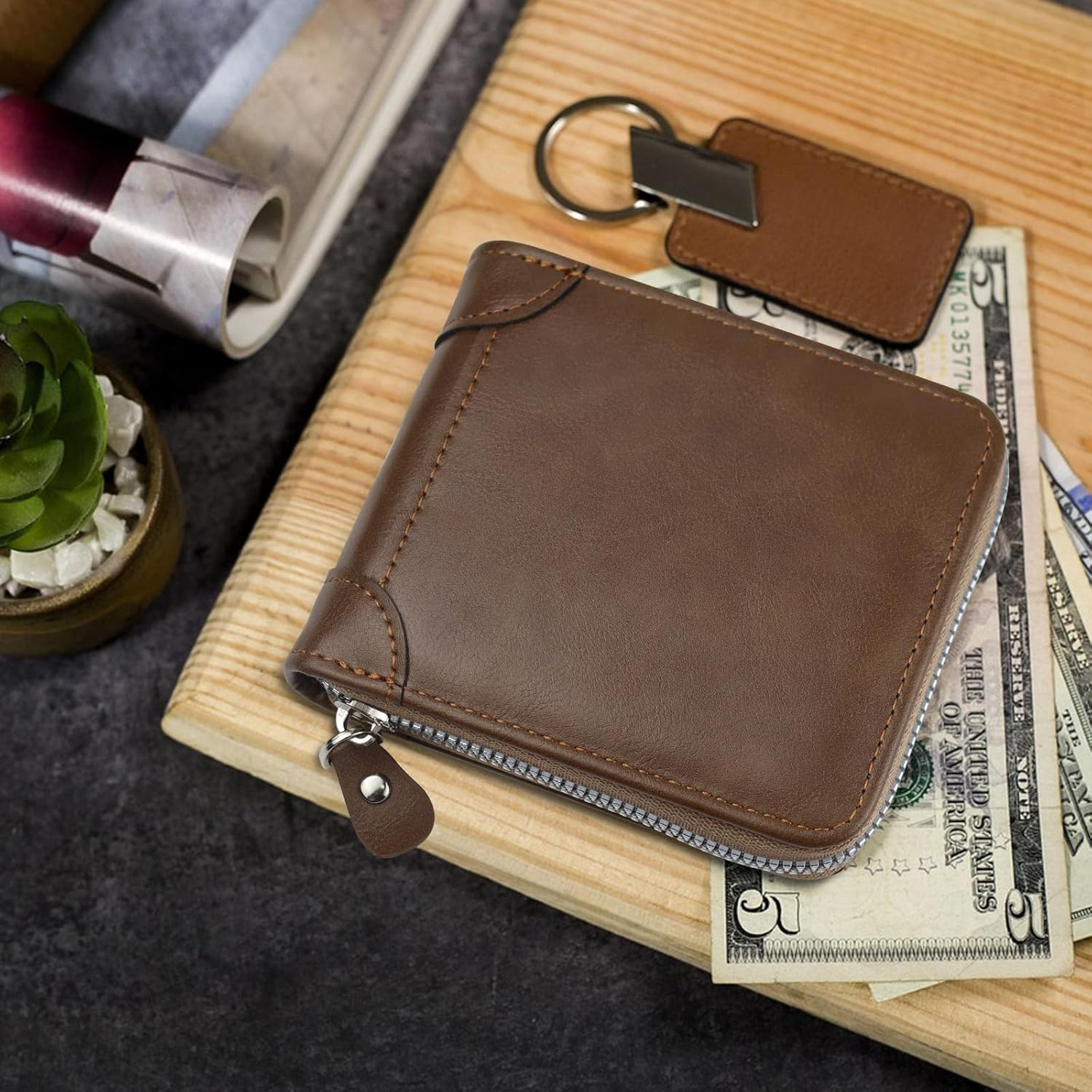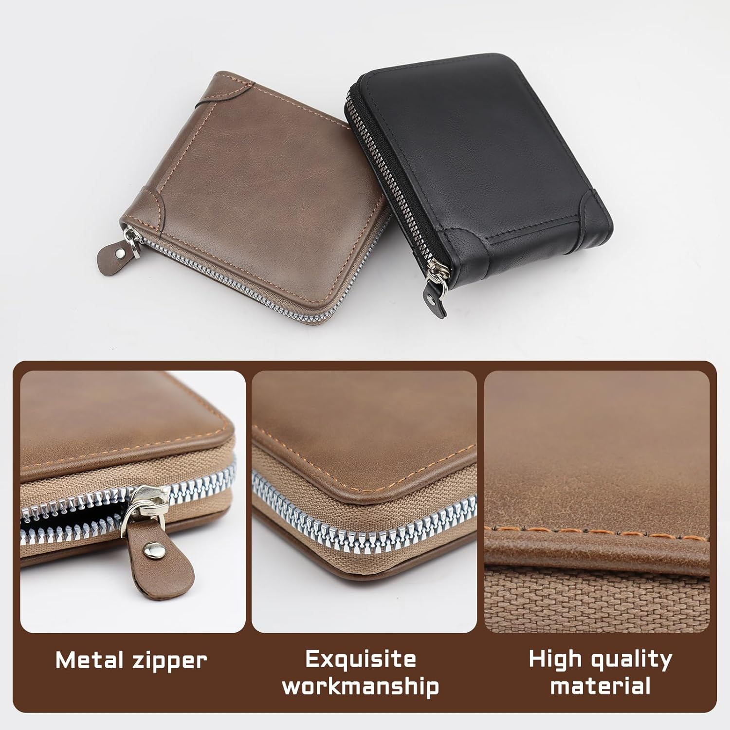 Sufficient Space: The slim wallet for men for men can hold up to 4 cards slot, 2 ID card slot, 1 buckle pocket, and 1 large opening cash pocket, let you easily carry your cards, cash, and and ID card Well-Made Quality: The wallets for men is made of hardware zipper and snap, the zipper is smoothy; It ensures the items doesn't fall and come out. The neat stitching wiring and fine leather provides durability Available in 2 Colors: There are two colors to choose from: black and brown. You can choose your favorite colors based on your preference. Different colors are fit for different outfit Simple Men's Wallet: This men's wallet features a simple design. All-black/brown leather texture and practical multi-card layer structure makes it demands most business men's aesthetic need Exquisite Gift: This card wallet for men can as gift to give your boyfriend, husband, father, male friends on Father's Day, birthday and other special festivals. It can enhance your relationship and also show concerns Specification: Material: PU leather Color: black/brown Size: 10.5 x 9.5x 3cm (4.13 x 3.74 x1.18inch) Weight: 85g Package: 1 x wallets for men Note: 1. Due to the different monitor and light effects, the actual color of the item might be slight. 2. Due to manual measurement and different measurement methods, please allow slight size errors. Thanks for your understanding!