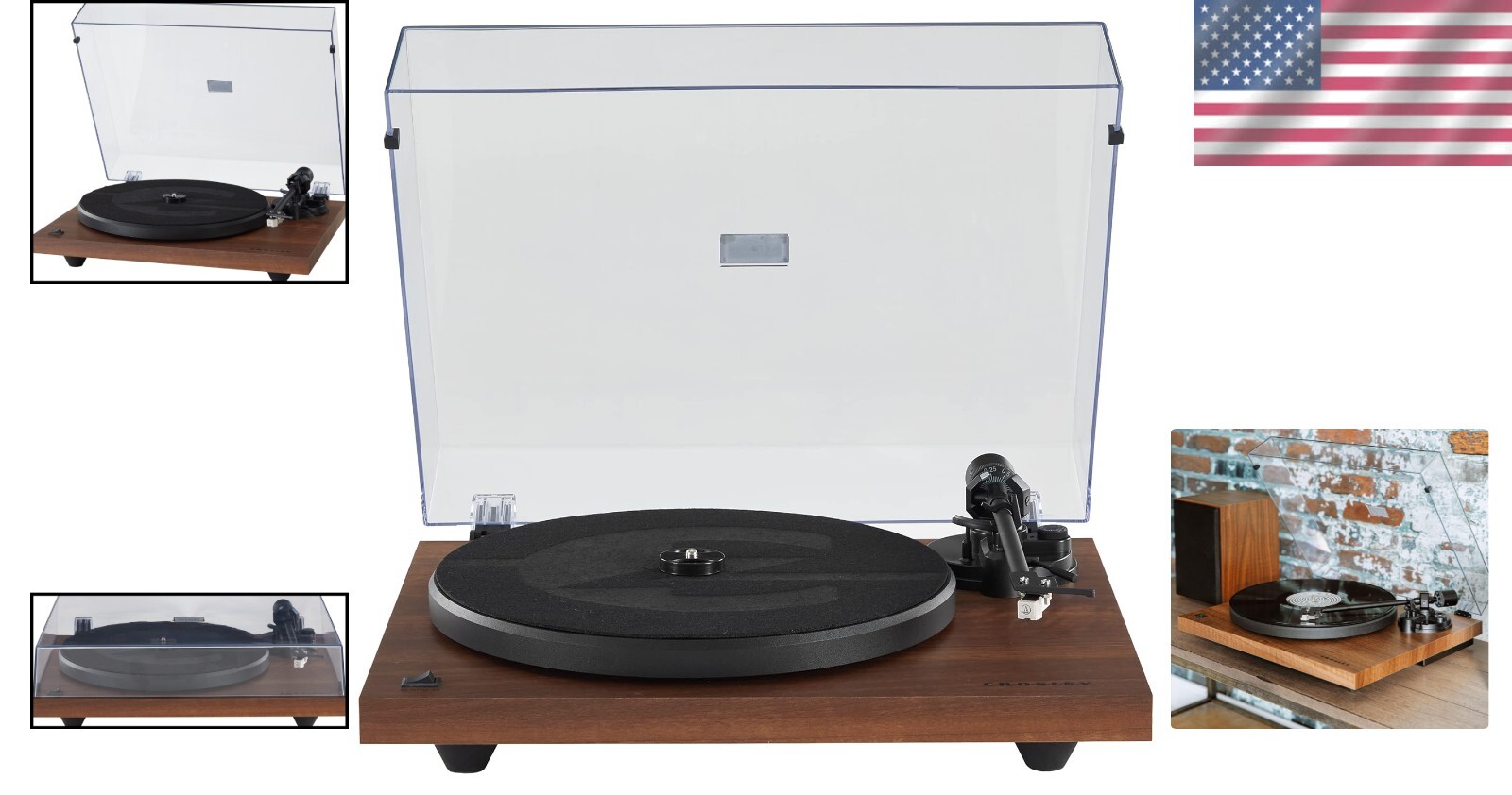 Belt-Drive Bluetooth Turntable Walnut 33 45 RPM Adjustable Tone Arm Audio ‹ › ‹ › ‹ › ‹ › ‹ › ‹ › ‹ › ‹ › ‹ › ‹ › Experience Classic Sound with Modern Precision Enjoy your vinyl collection with this expertly designed turntable, offering two-speed playback and auto stop for convenience. The 12-inch slipmat ensures your records stay in perfect position on the sturdy steel platter, providing a reliable listening experience. Versatile Playback – Supports 33 1/3 and 45 RPM records with auto stop feature. Components – Features an aluminum tonearm with a cueing lever, adjustable counterweight, and anti-skate control for confident needle placement. Exceptional Sound Quality – Set on a MDF plinth with a mounted Audio-Technica moving magnet cartridge. Low-vibration synchronous motor and resonance-dampening feet eliminate interference for smooth playback. Connectivity Options – Built-in Bluetooth receiver for wireless listening, switchable preamp, and RCA outputs to connect to your stereo or external speakers. (Speakers not included.) Vintage-Inspired Design – Combines century-old Crosley innovation with modern technology, proudly designed in the USA with dedicated customer support. Upgrade your audio setup with a turntable that offers reliable performance, superior sound, and stylish design. Perfect for vinyl enthusiasts who value quality and craftsmanship. Unit Quantity: 1 Item Height: 12.7 Centimeters Item Weight: 16 pounds Features: Belt Drive,Adjustable Tone Arm,Auto Stop,Dust Cover,Cueing Lever,Anti-skate Control Connectivity: Bluetooth,RCA Outputs Audio Outputs: Analog,RCA Outputs Speed Settings: 33.3RPM,45RPM Model: Bluetooth Turntable Color: Walnut Pitch Range: +/- 33 % Type: Turntable Band: Analog Unit Type: lb