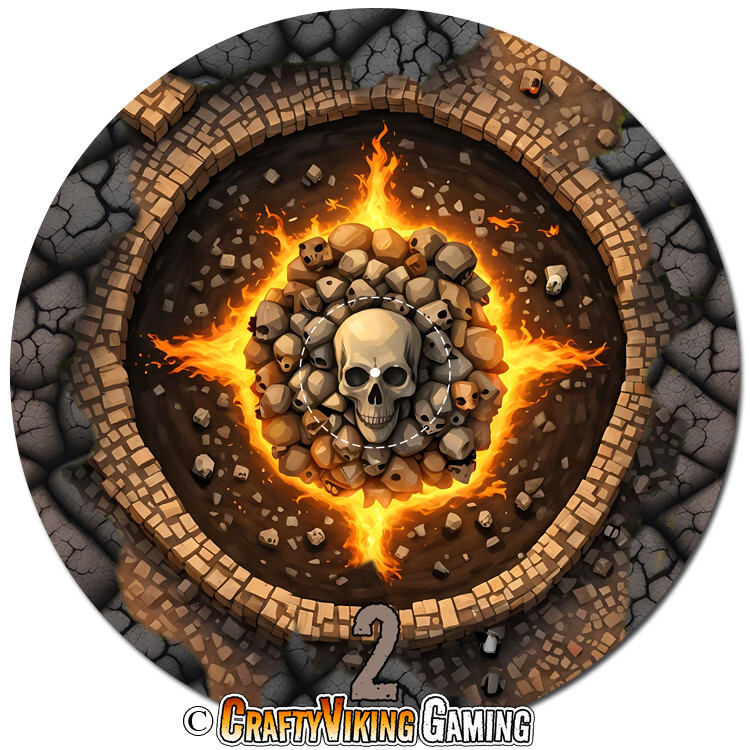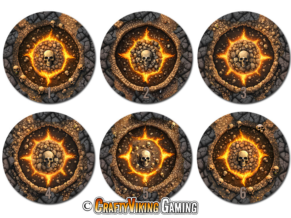 Cracked Earth Set of 6 objective markers for Warhammer 40K / Age of Sigmar 4th Ed. This set features a cracked earth terrain with a rock wall, skull piles, fire & brimestone. Numbered 1-6 40 mm (marked center circle) for simple measuring plus 3 inches to the edge Total diameter 192 mm or 7.57 inches 2 mm thin neoprene (mouse-pad) material Non-slip rubber backing Enhance your gaming experience with these high quality attractive objective markers. No more guessing if a model is in range. Thanks for shopping & happy gaming!