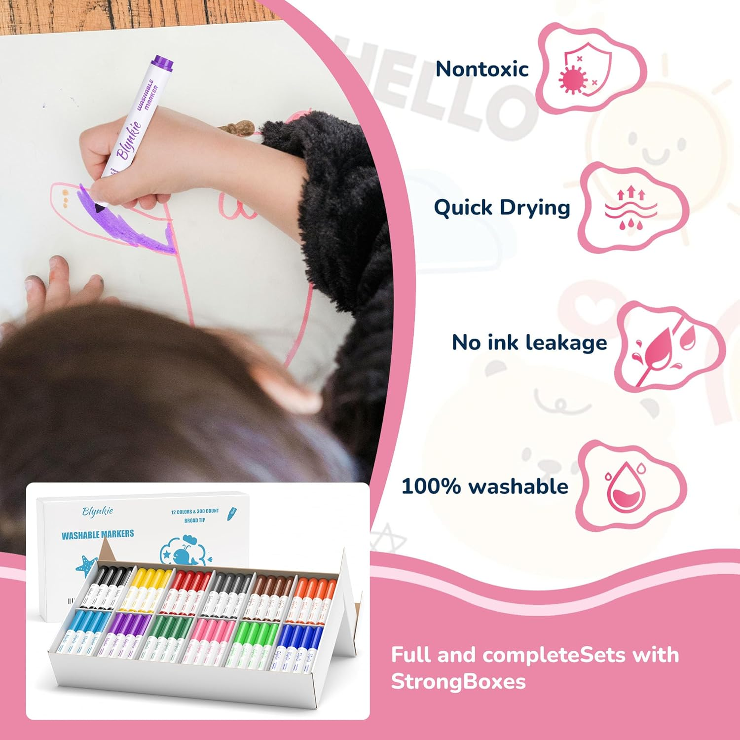 Washable Markers Bulk 300 Pack in 12 Vibrant Colors Broad Line Conical Tips- This classroom bulk pack comes with 300 washable markers in a robust box, containing 25 of each of 12 vibrant colors. 12 colors including Black, Gray, Dark Blue, Light Blue, Red, Orange, Light Orange, Pink, Yellow, Light Green, Green, Dark Green, Light Red Ideal for school projects, homework assignments, and crafting activities, these markers are an excellent choice for teachers as educational supplies. Essential supplies for school classrooms: This bulk marker pen has a sturdy outer box that can well protect the watercolor pen inside. The inside of the box is divided, and each color is arranged in order. When using it, you can quickly find the color you want. It is also very easy to store after use, avoiding the problem of loss. The time of students and teachers is saved and efficiency is improved. It is a must-have learning supply for teachers and students. Featuring a sturdy box for convenient storage, they are perfectly suited for classroom use and are ideal for children aged 3 and above. 300 count washable markers come in a box, contains 25 each of 12 different colors, classroom bulk pack. Delivery & Easy Returns Guess what? FREE shipping to all 48 states! Yup, you heard that right—free, like a high-five from the universe. Your order will be out the door in 1-2 days—quicker than you can say "Where’s my package?" And hey, if it’s not exactly what you dreamed of, no worries! Our 30-day FREE return policy is like having a do-over button for your shopping spree. How cool is that? Your Feedback Makes Us Smile You happy? We’re doing a little happy dance over here! Drop us a line, and let’s keep this good vibe going! Something not quite right? Uh-oh, we’ll fix it faster than you can say “Customer service!” because your smile is our mission. We’re here, we’re listening, and we’re all about making your day a little brighter. Cheers to awesome shopping!