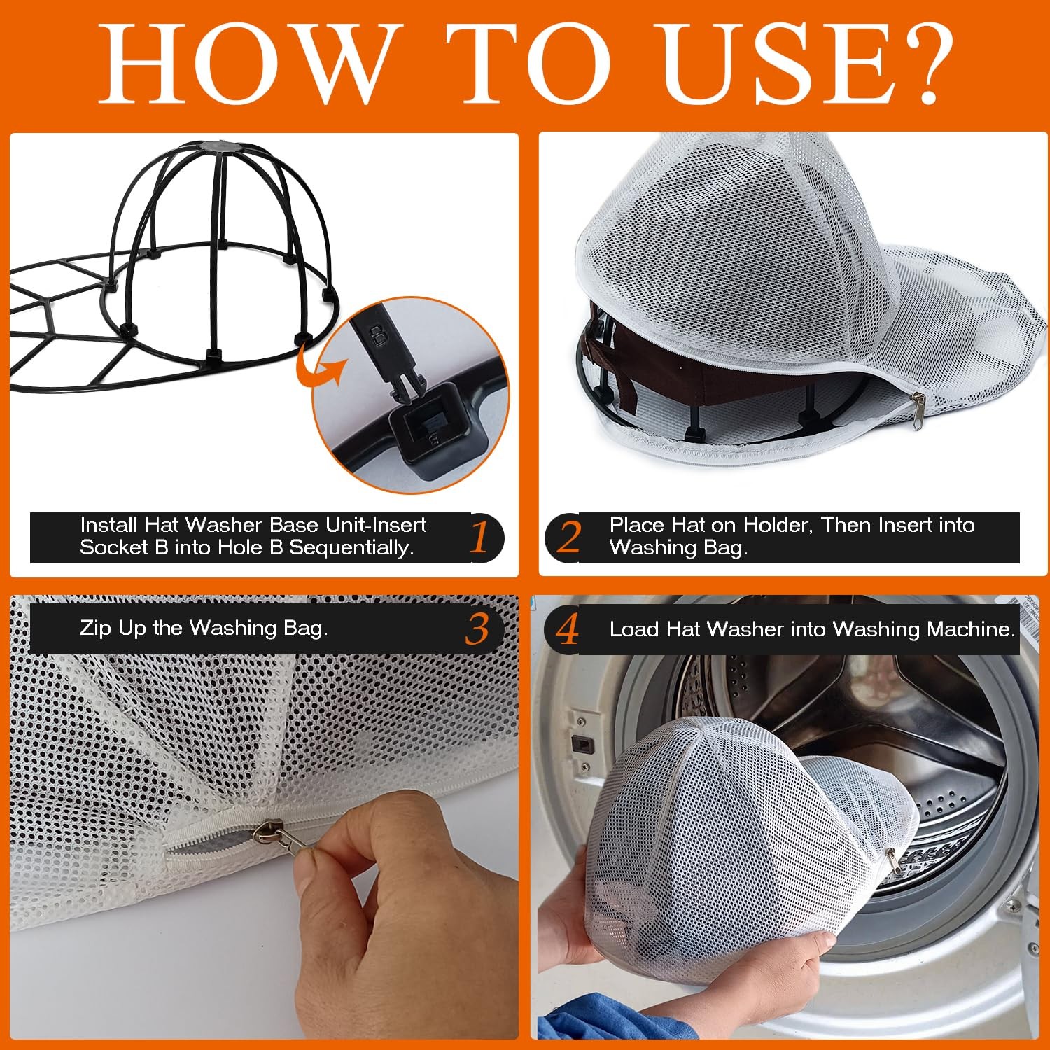 Easy to Use and Works. Toss in gentle cycle with other wash and let it air dry or partially dry hat in low dryer setting. Open the hat holder and reseat the hat in the hat washer, and let it shape until totally dry. Upgraded Hat Washing Cage with Mesh Cover: The hat washer's upgraded mesh cover and zip closure design make it super easy to place and retrieve your hats; The mesh hat cleaner for baseball caps prevents wear and tear, ensuring your caps free from lint Superior Protection: Crafted from high-quality plastic, this hat washer for washing machine effectively maintains the shape of your baseball hats during washing; Say goodbye to misshapen hats, keep them neat and clean with this baseball hat washer cage Suitable for Various Baseball Caps: Baseball hat cleaner's thoughtfully designed sizing accommodates a variety of baseball caps; Whether it’s a fitted cap or a snapback, this hat cage for washing machine is your go-to solution for secure washing。 Effortless Assembly: This hat washer cage is designed for convenience! In just a few simple steps, you'll have baseball cap washing cage ready to protect your favorite baseball caps; Spend less time assembling hat cage and more time enjoying your hats. Multi-Purpose: Not only is the cap washer a washing essential, but it also doubles as a hat organizer and shaper; Hat cleaning cage is compatible with washing machines and dishwashers, it's a must-have for maintaining your hats' pristine condition