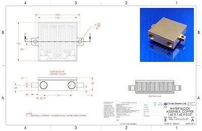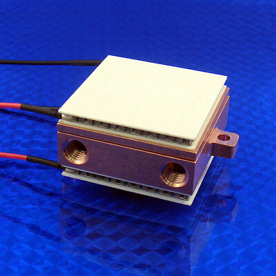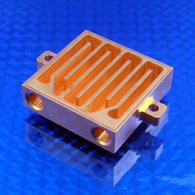 All copper water block Liquid cold plate heat exchanger to rapidly remove heat from CPUs, Xbox CPUs, GPUs, video cards, IGBTs ( SOT-227 cooling ), power electronics, lasers, peltier TECs or power generation TEGs. Most efficient method of removing heat from electronics. Heat removal is 4 to 5 times greater with this water block than using just a finned heat sink. Components can be mounted to one or both sides thereby allowing heat removal from two 40x40mm TECs or other electronic components at the same time. All copper construction allows for parts and components to be soldered to cold plate for maximum thermal conduction. Superior USA manufacturing, CNC machined from solid 99.9% pure copper. Do not confuse this liquid cooling plate (waterblock) with inferior cheap water blocks that will NOT deliver on cooling ability. You get what you pay for. 100% Made in the USA by Custom Thermoelectric, LLC., based in Bishopville, Maryland. Measures: 1.62 x 1.62 x 0.55 inches Weighs: .34 lbs (154 gm) Inlet and Outlet on the same side. Usable flat area of 1.62 x 1.62 inches (41 x 41 mm) per side Inlet & outlet tapped 1/16" NPT: Comes with 2 pieces Nylon barbed tube fittings for 3/16" ID tubing. Will accommodate per side ; Single TECs or TEGs up to 40 x 40mm 2, 3, or 4 TECs up to 20 x 20mm Any component (to be cooled) up to 41x41mm CNC Machined from a solid billet of copper. solder brazed together to a 100 psi rated watertight seal. Minimum flow rate: 0.1 gpm. Maximum flow rate: 2.5 gpm. Water flow rate GPM Thermal Resistance °C/watt 0.2 0.044 0.4 0.033 0.6 0.029 0.8 0.025 1.0 0.023 eBay no longer allows external links for spec sheets and drawings. Please Google the part number WBA-1.63-0.55-CU-01 and this product page will show up with all the spec sheets, data, drawings and 3D models you need. PDF of Thermal Resistance graph for this Water Block: 3D Solid models are available at no charge, just ask. Matching cold plate (last picture) is part number CPT-2.25-1.62-0.25-AL and is NOT included in this auction. NOTE: Some pictures show the water block as separate pieces. This is only to show the details of the high heat transfer efficiency design of the interior surfaces. All water blocks come assembled ready to use . Water blocks are also called; Waterblock or waterblocks Cold plate or cold plates Liquid exchanger or liquid heat exchanger Liquid manifold Water jacket Peltier Liquid Block or Thermoelectric Liquid Block Liquid cooler Liquid cold plate or Liquid Cold Plates Liquid cooling plate Liquid heat sink or liquid heatsink Water cooling plate or water cold plate Liquid chassis Custom water blocks available. Please contact us.