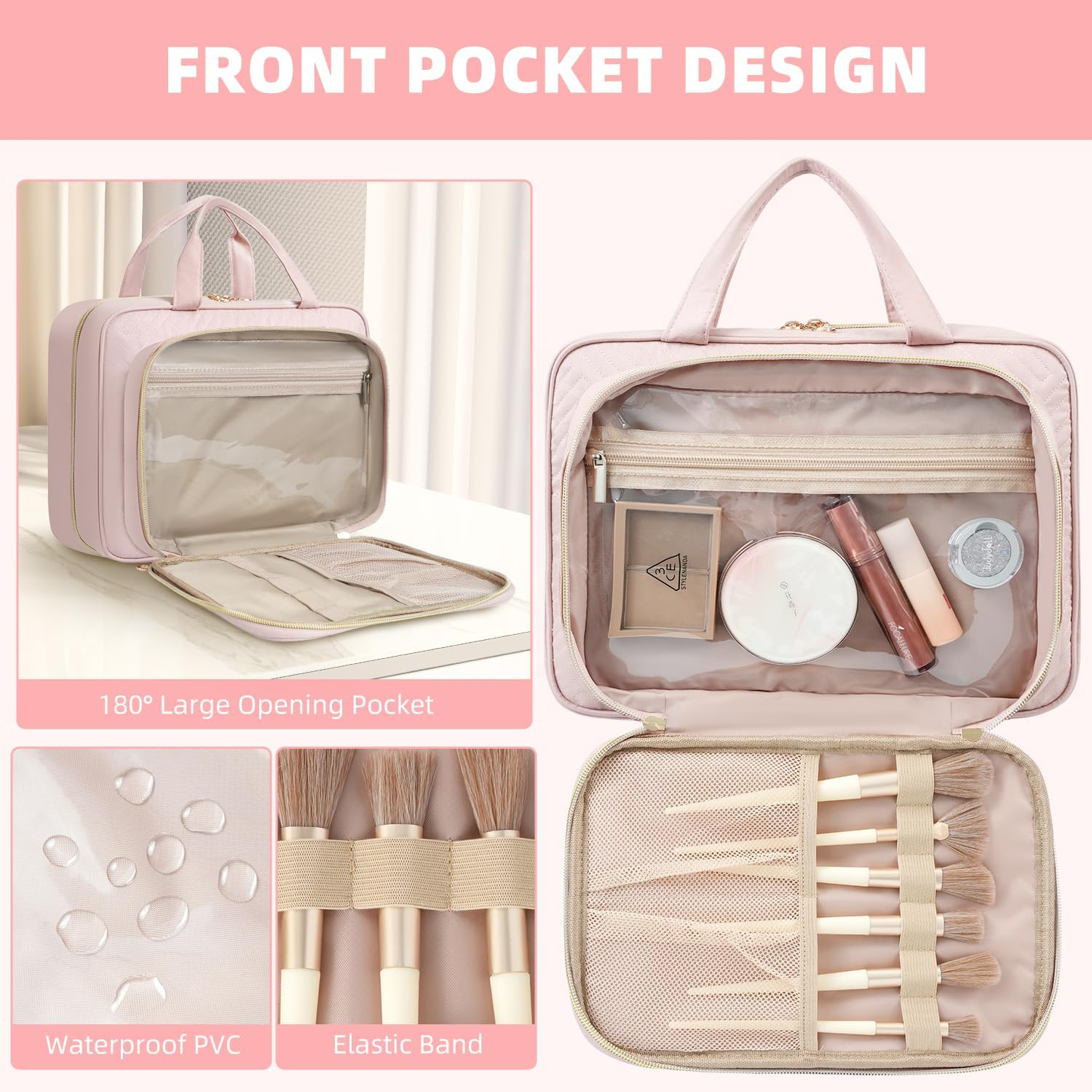 SOFT MATERIAL: The surface of this cosmetic bag is made of Peach skin Velvet, which is very comfortable to touch, that is great feel for use lNNER POCKETS: The main inner pockets with elastic straps can grasp bottles firmly . All the inner pockets are made of PVC, easy to cleaning EASY TO USE: Two-way zipper is very convenient in use, 360 degree rotatable metal hook can suitable different hanging needs LARGE CAPACITY: This make bag is large enough to hold all kinds of travel essentials, such as cosmetics, toiletries, skin care products, brushes and so on VARIOUS PURPOSE: you can use it not only for traveling, but also in daily life, and it's also a good choice for your friends Product Description