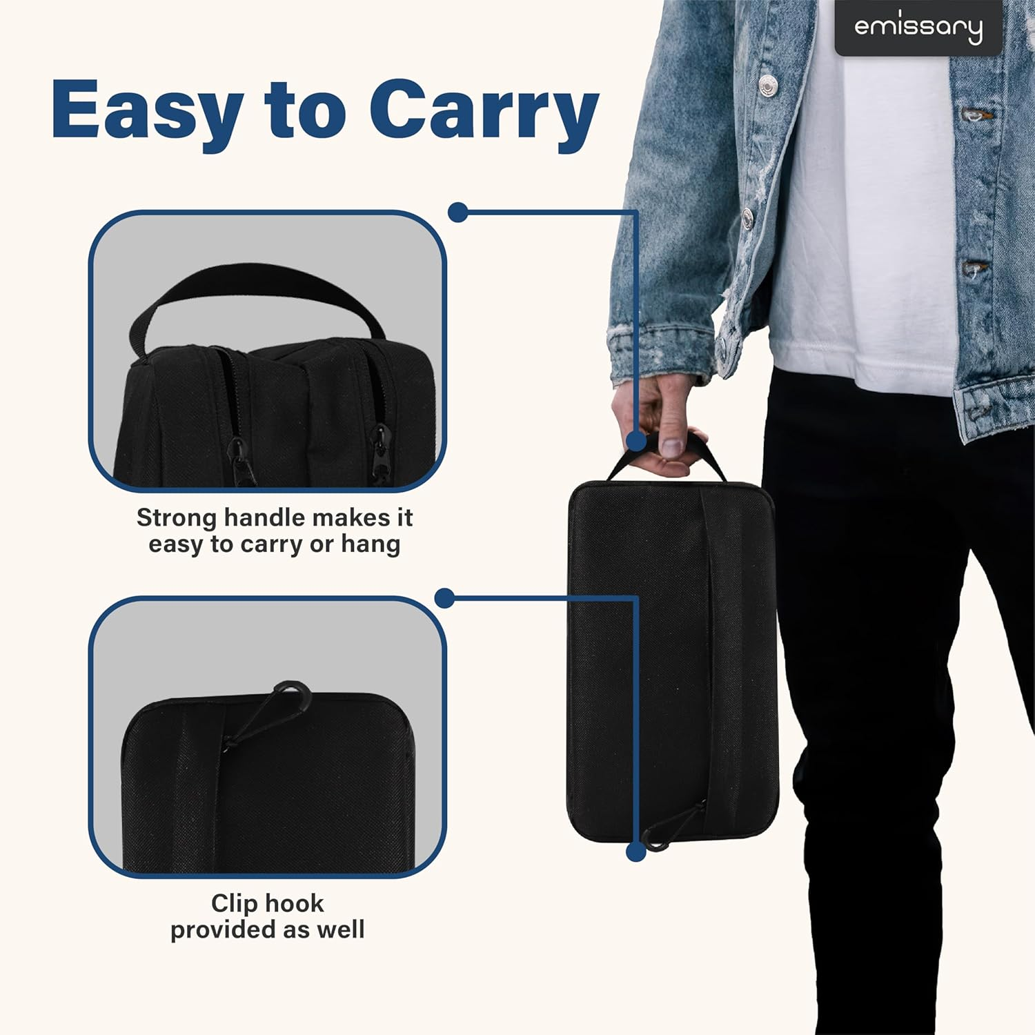 Store New Arrivals Add to Favorite View Feedback Toiletry Bag for Men, Water Resistant Bathroom Bag Men'S Shaving Kit, Dopp Kit for Men, Waterproof Toiletry Bag, Shaving Bag, Hygiene Bag, Mens Toiletry Bag - Black Description Item model number PS04032 Color Black Product Dimensions 5.91 x 0.79 x 12.01 inches Country of Origin China Item Weight 5.6 ounces Department unisex-adult CONVENIENT MULTI-USE BAG: Whether you are travelling for business or personal reasons, this high quality oxford toiletry bag will certainly meet your needs; It was designed for both men and women, and is an extremely versatile wash bag that can be used as a traditional toiletry bag or shaving kit bag, a safe place to store your items while traveling, or it can be used as a carry-on airline bag to store needed in-flight toiletries MADE FOR AND PORTABILITY: Designed with the traveler in mind, this kit comes with a durable side handle to ensure that carrying your bag while traveling is made easy. HIGH-QUALITY DURABLE MATERIAL: This exceptional toiletry bag by emissary is made of high quality oxford, which is known for its lightweight yet durable qualities, the perfect combination for traveling; This specific material is water resistant, making it safe for use in environments where it may become wet; Making this the perfect bathroom bag, shaving bag, and dopp kit. LARGE TOILETRY BAG, LARGER THAN IT LOOKS: Compact yet spacious, this bag provides adequate room for all your essentials. The bag as a whole measures over 9.8'' L x 5.9'' W x 4.5'' H in Inches / 25cm L x 15cm W x 11.5cm H, with a volume of nearly 4 L. Emissary Promise: At Emissary, we are dedicated to delivering products that combine durability, style, and functionality to make your and daily life easier. Your satisfaction is our top priority. If you have any questions or concerns regarding your purchase, please contact us directly through 's messaging system. Thank you for your purchase. Product Description Whether you are travelling for business or personal reasons, this high quality oxford toiletry bag will certainly meet your needs. Large Capacity Size 9.8 x 5.9 x 4.5 inches. Put shampoos and conditioners in small bottles into 3 small mesh pockets Put small sponge, floss picks,Facial cleanser into 1 long mesh pocket with zipper inside. Put toothpaste, comb, wipes into 1 front zipper pocket. Organized Compartments 2 Main compartment 1 Front pocket 1 Inner zipper pocket 2 Small mesh pockets Made for and Portability Designed with the traveler in mind, this kit comes with a durable side handle to ensure that carrying your bag while traveling is made easy. Premium Material The toiletry bag is made of premium polyester that is smell-less,it can also protect your toiletries from splashed water. Comparison of similar toiletry bags Add to Cart Add to Cart Add to Cart Add to Cart Customer Reviews 4.5 out of 5 stars 84 4.7 out of 5 stars 11,487 4.6 out of 5 stars 2,985 4.6 out of 5 stars 1,342 Price $9.99 $ 9 . 99 $17.97 $ 17 . 97 $11.99 $ 11 . 99 $9.99 $ 9 . 99 Material Quality Polyester Quality Leather and Canvas Quality Polyester Quality Polyester Pattern Solid Solid Solid Solid Color Black Dark Gray Black Black Size 5.91 x 0.79 x 12.01 inches 9.8 x 5.9 x 4.5 inches 9.25 x 4.72 x 4.72 inches 10 x 4 x 6 inches Weight 5.6 ounces 7.4 ounces 5.29 ounces 6.4 ounces ABOUT US We offer the best prices around on high quality products. Our E-store includes media such as books, movies, music and games while offering electronics, toys, sporting apparel, clothing, tools, general home, garden items and more. SHIPPING We are always working hard to ensure your package arrives as soon as possible. Please understand that some factors like weather, high postal traffic, and the performance of shipping companies are outside of our control. We offer free shipping to the lower 48 states and ship within 2 business days of payment, usually sooner. We do not accept P.O. Boxes. Please provide a physical address. RETURNS We offer a 30-Day Return Policy on items which you are not completely satisfied with. You have the option for a full-refund or an exchange of the item. No returns are available on items shipped outside of the USA. PAYMENT We accept PayPal. CONTACT US This page content is yet to come Please ad us to your favorite seller and visit again later Thank You