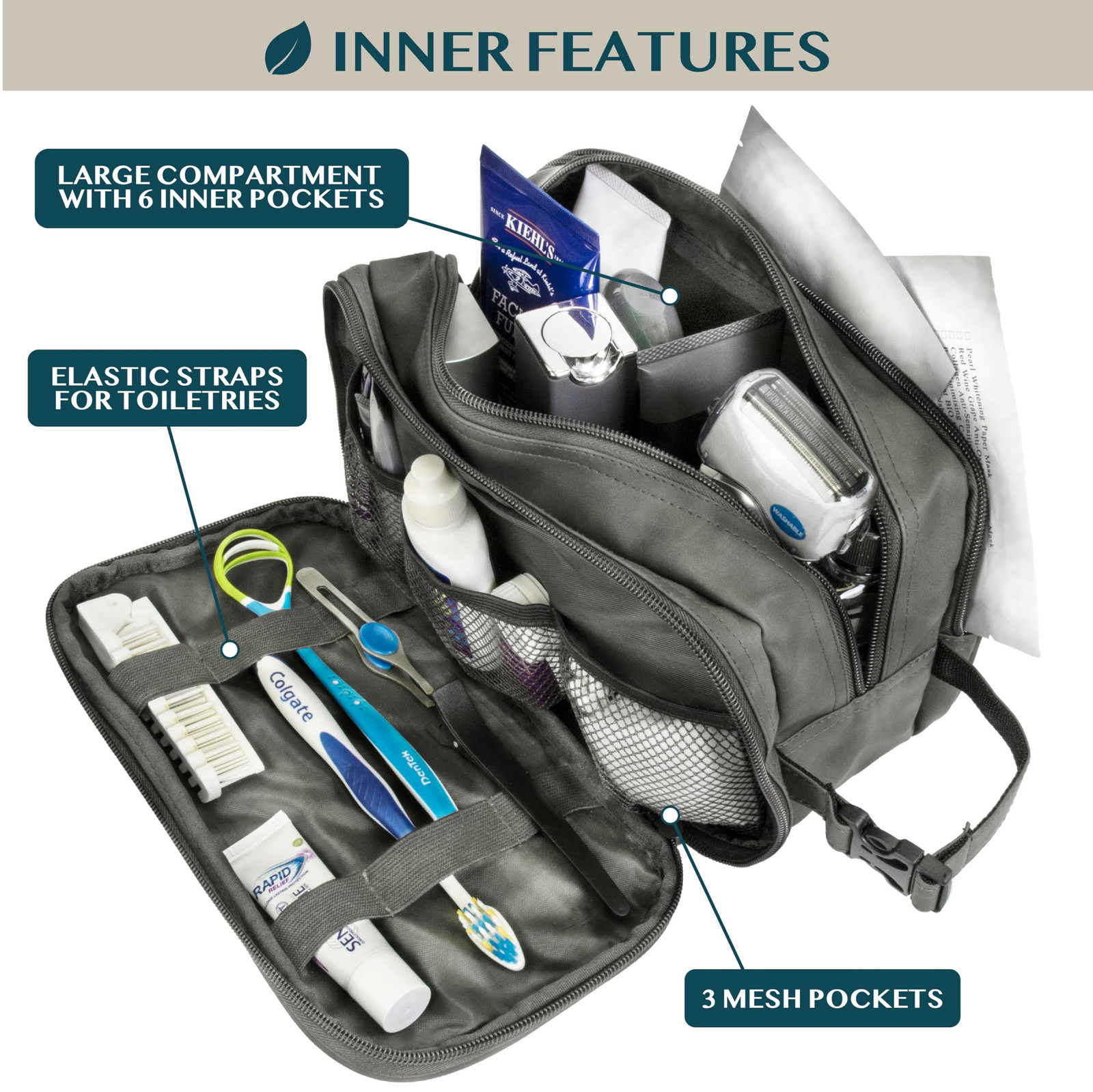 TOILETRY BAG FOR MEN: Measures 10.5 x 5.5 x 6 inches (L x W x H), This functional PU leather toiletry travel bag has a large compartment and side pockets with additional pockets to hold all your toiletry, shaving, and grooming accessories. Equipped with elastic bands and additional mesh pockets to keep your hygiene items secured while traveling, weekend trip at hotel, or at home, this cosmetic make up case will help you stay organized. LARGE OPENING TOILETRIES TRAVEL BAG: This toiletry bag organizer has wide zipper design that allows for easy access to the large main compartment. With one simple pull on the handle, you can easily access key accessories such as shaving kit, tooth brush, and shampoo. This toiletry travel bag has the convenient design that helps you stay organized and makes this travel bag case an essentials during any traveling, flights, hotel stay, and weekend vacation. WATER RESISTANT TOILETRY BAG DOPP KIT: This toiletry case kit is made from high density PU leather with added side padding for durability and extra protection to keep your toiletries safe and protected during travel. The lining is water-resistant to prevent liquid splashes from entering the bag or luggage. The toiletry bag also offers excellent wet/dry separation so you can keep wet accessories in a separate compartment from dry toiletries during camping, road trips, weekenders. TRAVEL ESSENTIALS FOR MEN: The handle has a clip-on buckle to easily attach any bathroom bars and hangers so you can easily access this travel organizer in hotel rooms, bathroom, and showers. Its compact design means the toiletry bag is easy to pack and fits well in luggage and backpacks. This makes a great gift for father, men, boyfriend, uncle, husband, groomsmen and is especially appropriate for fathers day, Christmas, Birthday and those who love to travel. LARGE CAPACITY TOILETRY TRAVELING BAG: the toiletry bag is large and roomy with ample room to all essentials, accessories and toiletries during travel or home use. Easily fits all shaving kits, toothpastes, showering bathroom tools in this bag. Simply wipe clean with a damp cloth.