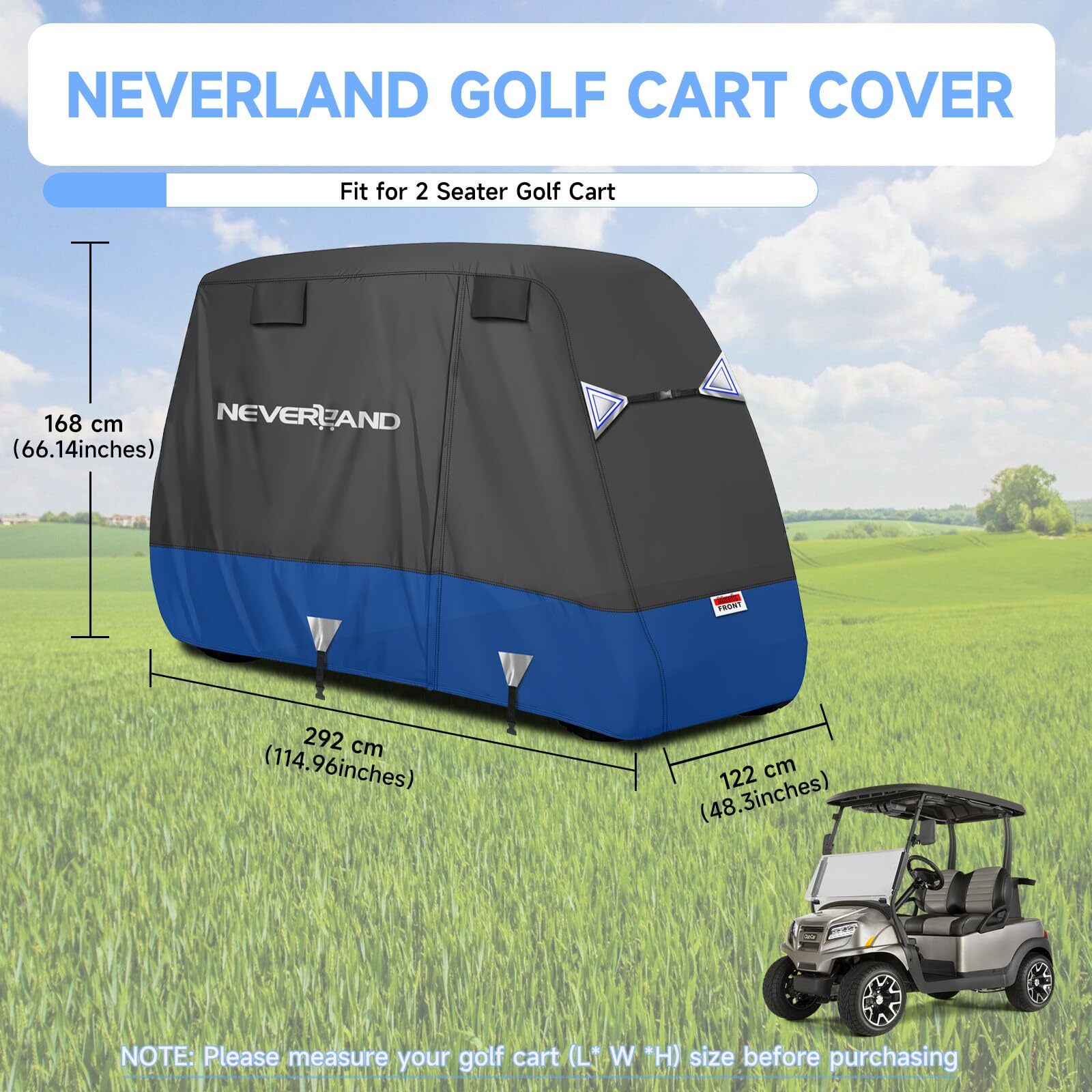 Golf Cart Cover - Waterproof, Sunproof & Windproof - Fits Yamaha, EZ GO & Club Car - Black+Blue, 2 Passenger GOLF COVER SIZE - 95" L *48" W *66" H, designed to fit most 4-passenger golf carts with extended roofs up to 80". Accommodates 2 rear seats, armrests, and footrests, compatible with brands like Yamaha, Club Car, and EZGO. (Tip: Please check the size and model before purchasing.) UNIQUE EXTERIOR DESIGN - ① Stylish color combinations make your golf cart cover stand out. ② Adjustable windproof buckles, a hem cord, and added horizontal straps at the front and rear ensure a snug fit and 360° wind protection. ③ Reflective strips on both the front, rear, and sides enhance visibility and safety during nighttime use ERGONOMIC DESIGN - ① The golf cart cover zipper on the sides facilitate taking the items out of golf cart without even removing the golf cart cover. ② There are vents on both sides to allow for air circulation, which prevents the inner side from being stuffy, and ensures dryness in the golf cart PREMIUM MATERIAL - Made from 600D Oxford fabric, this golf cart cover provides strong, long-lasting protection. It effectively shields your golf cart's finish from rain, heat, sun, snow, and scratches, ensuring durability and reliable performance 600D WATERPROOF - ① The golf cart cover features a special coating with a water pressure resistance of 3000PA. ② The waterproof zipper is equipped with a protective cover and secured with a velcro strap at the bottom for added protection, ensuring complete waterproof performance Golf Cart Cover - Waterproof Golf Cart Covers - Fits for Yamaha Golf Carts EZ GO Club Car - Outdoor Windproof Sunproof (Black+Blue, Fit for 2 Passenger Cart) Shipping We offer FREE shipping on all orders! We ship within Three business days of payment, usually sooner. We use a selection of shipping services such as UPS, FedEx, USPS etc. We only ship to the lower 48 states, no APO/FPO addresses or PO Boxes allowed. Local pickups and combined shipping options are not provided at this time. Return You can return a product for up to 30 days from the date you purchased it. Any product you return must be in the same condition you received it and in the original packaging. Please keep the receipt. Payment We accept payment by any of the following methods: PayPal Please pay as soon as possible after winning an auction, as that will allow us to post your item to you sooner! Feedback Customer satisfaction is very important to us. If you have any problem with your order, please contact us and we will do our best to make you satisfied. Contact Us If you have any queries, please contact us via ebay. We usually respond within 24 hours on weekdays. Please visit our eBay store to check out other items for sale! Thank you for shopping at our store.