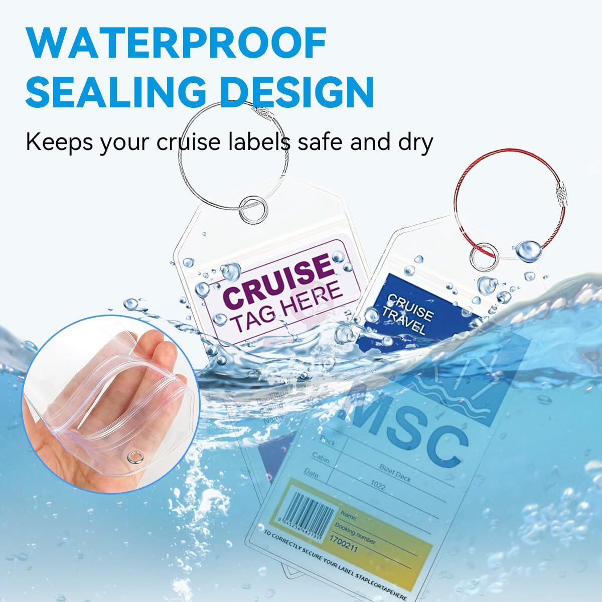 cruise luggage tags, your gateway to a relaxed, organised and stylish cruise. Ensure each baggage transfer is seamless and enjoy a worry-free cruise experience! PERFECT SIZE: These must-have cruise luggage tags measure 3.70" (9.4cm) x 7.48" (19cm), wider to provide ample space to easily fit cruise tickets. Colourful steel rings measure 0.08" (0.2cm) x 7.48" (19cm), an extended steel ring makes installation a breeze! DURABLE STURDY: Constructed from high quality clear PVC material with a sturdy metal eyelet,it features a reliable waterproof seal that protects your tags from moisture, ensuring they stay intact and the information is always easy to read, even in wet conditions. USER-FRIENDLY: These luggage tags are easy to use. Simply fold your printed paper tag and insert it into the clear PVC holder. The sturdy steel ring allows for quick and easy attachment to and removal from your luggage, ensuring that your belongings arrive safely and punctually at your cabin. CRUISE ESSENTIALS: This luggage tag is compatible with a wide range of cruise lines including Carnival, NCL, Princess, MSC, Holland America, P&O, Costa, Azamara, Cunard, Seven Seas and Viking River. No matter which cruise you're going on, you can rely on these luggage tags to make your journey smooth and worry-free.