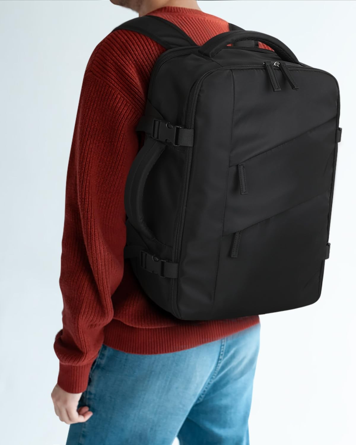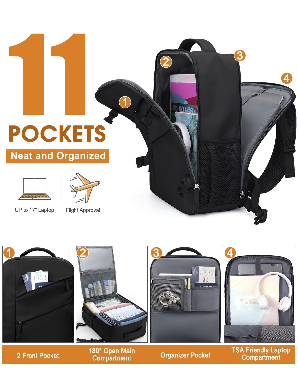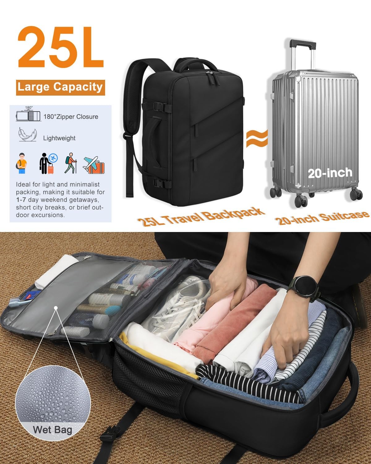 Travel Backpack for Women Men Waterproof Laptop Backpack Flight Approved Carry On Backpack Overnight Weekender Bag College Bookbag for Business, Work, Traveling Fits 17 '' Laptop,Black TSA-Friendly Carry-On Backpack:180°opening laptop compartment allows you to lay your laptop flat without removing it, speeding up the airport security.Dimensions 13.5 x 18.5 x 7 inch, it fits most airline regulations for carry-on bags, keeps your essentials close at hand, and saves time by avoiding checked baggage.Compact and lightweight, it’s easy to carry around and store in overhead compartment or under your seat. Enjoy hassle-free travel with travel backpack today! 25L Capacity & 11 Pockets to Keep Organized:Roomy main compartments with 180° opening zipper allow access from the top like a traditional backpack or fully open like a suitcase. Say goodbye to mess and now every item has its place.2 front pockets for easy access to travel essentials, while a dedicated wet/dry bag separates toiletries. 1 zipper mesh pocket provides visual storage, Padded laptop compartment with 1 organizer pocket is nice for small items, keeping everything neat and within reach. Ergonomic Design & 3-in-1 Backpack:Tailored with adjustable shoulder straps and a 10MM thickened three-point back support panel.This thoughtful construction improves airflow and evenly distributes weight across your back, ensuring maximum comfort even in extended wear. The backpack mode functions as a stylish daypack, the luggage strap allows you to secure it to your suitcase, adding extra convenience. , and side handle helps you seamlessly transition from a backpack to a carry-on bag. 4 Unpate Side Compression Buckle & Double Zipper: 4 upgraded side compression buckles let you easily adjust the bag to keep everything in place, no more rummaging through a jumbled mess, and eliminate your concerns about unintended openings. The matching double zippers add a touch of style while making it easy to search your bag. Thickened side mesh pocket perfect for your umbrella and water bottle. Every little thoughtful feature is designed to make your life easier and your travels smoother. Water-resistant Materials & Wonderful Customer service:Our backpacks are made of new-generation water-resistant polyester to protect your belongings from light rain and splashes. It functions perfectly as a college backpack, a travel companion, or a reliable commuter bag for work, seamlessly adapting to your daily needs. Excellence Customer Service-Whatever you need, whenever you need it, we are here for you!