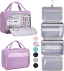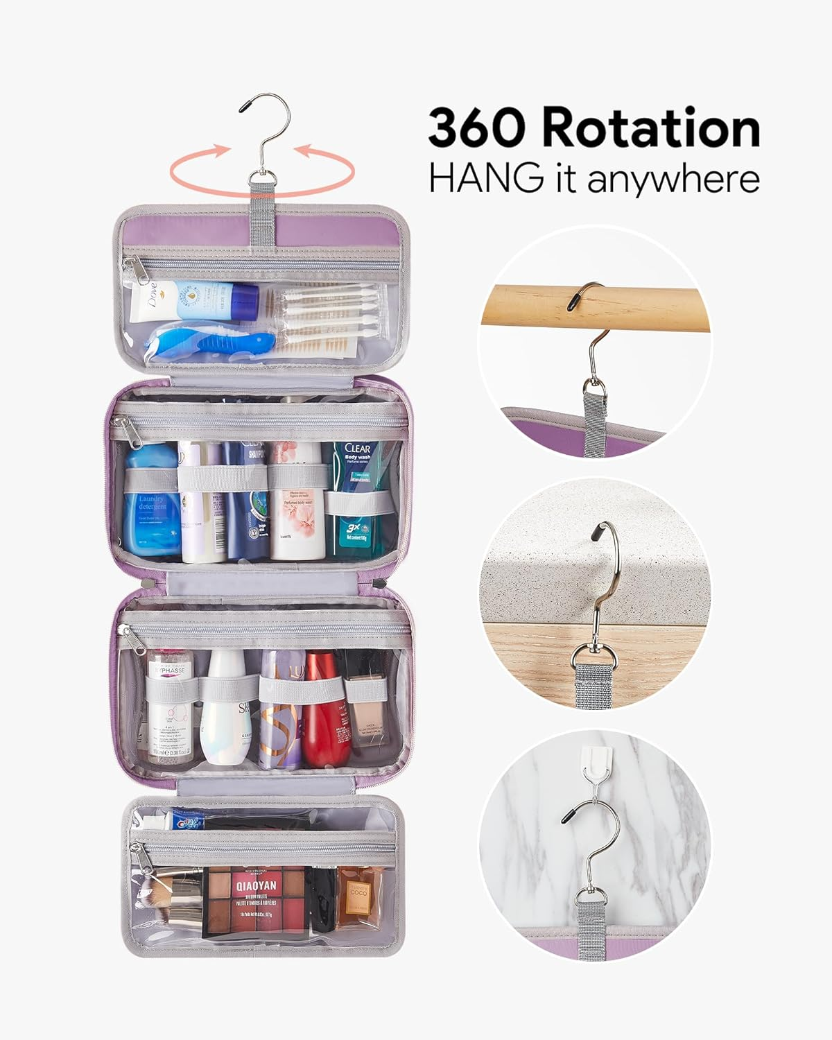 Smart Storage & Travel-Friendly : Choose the perfect size for your trip! Available in M (10.63”L x 6.69”W x 3.94”H) and L (12.6”L x 9.06”W x 4.72”H), this travel-friendly toiletry bag keeps your travel-sized toiletries, makeup, jewelry, and accessories neatly organized. Thoughtfully designed compartments maximize space without adding bulk, ensuring a lightweight and organized travel experience. Whether packing for a solo getaway, a couple’s retreat, or a family vacation, this bag folds compactly to fit into suitcases, backpacks, and carry-ons. Jewelry & Accessory Storage : This hanging toiletry case is designed for ultimate convenience, with a built-in jewelry pouch to keep rings, bracelets, earrings, and other small accessories secure and tangle-free. Four additional compartments neatly organize travel toiletries and makeup essentials, making it the perfect travel organizer for business trips, vacations, cruise holidays, or everyday use at home or on the go. Waterproof & Durable : Built to last! Made from premium embossed eco-friendly reinforced fiber, this toiletry bag features a soft-touch finish while effectively repelling water, dust, and spills, keeping your essentials dry and protected. Reinforced stitching and sturdy zippers enhance durability, making it a reliable companion for bathrooms, travel showers, and outdoor adventures. Hanging Hook & See-Through Panel : Convenient and mess-free! The 360° rotating, non-slip metal hook lets you hang this bag on bathroom doors, towel racks, or closet rods, keeping your toiletries within reach. The clear panel provides instant visibility, so you can quickly grab what you need without rummaging through your bag. Plus, the upright design prevents leaks, and when you're done, it folds flat for compact storage. Secure & Flexible Dual Elastic Bands : This travel toiletry bag features two elastic bands, allowing you to choose the most suitable band based on the size of your toiletries. Whether storing smaller travel-size bottles or slightly larger containers, these bands provide a secure and stable fit, preventing spills and shifting during travel. Product Description 1 Waterproof Performance 2 Stitching & Waterproof 3 360 Rotation Hook 4 Double Band & Zipper