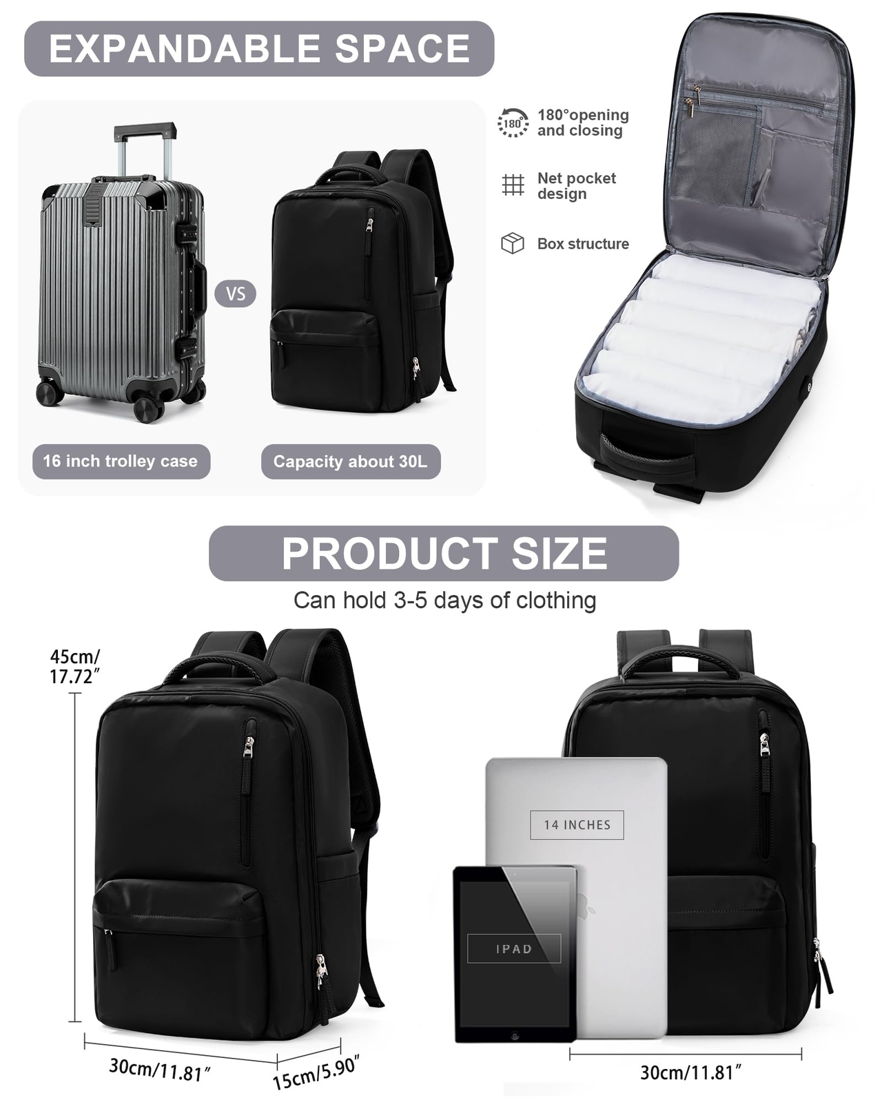 Travel Essentials Backpack for Women Men,Laptop Carry on Backpack with Laptop Compartment,Waterproof Work Personal Item Size Backpack Bag with USB Charging Port,Black 🔍 Product Highlights Description Backpack ✅ Features 【Large Capacity Multi-pocket Backpack】The travel backpack with many compartments holds about 30L.The main pocket can hold goods, and fit 3-5 pcs of clothes.The front compartment with various pockets can be used to store notebooks, pens, earphones, and other small items,for quick pick out.The travel bag has a built-in laptop compartment that fits most 14-inch laptops. 【With USB Charging Port】The travel backpack has a USB port that allows you to charge your electronic devices by connecting to your own power bank, giving you a more convenient way to charge your phone on the travel. 【Artificial aesthetic shoulder strap design】The sturdy padded shoulder straps and back panel of the laptop backpack, made of waterproof nylon fabric on the back, can help reduce back sweating. Adjustable shoulder straps ensure stable and comfortable walking during travel. 【Suitable for various occasions】This stylish travel backpack has a simple appearance and is suitable for pairing with any outfit. Due to its practical design, it can be applied to various occasions, such as leisure, daily travel, work, and even short distance travel. 🚚 Delivery Details We do not ship to a different address. we will ship to the address you provide on the ebay only. Please check your address before purchase. Quick and reliable shipping. Orders are processed within 1-2 business days. It should take 3-5 business days for the product to reach your destination (Saturday and Sunday excluded). If it takes any longer than that, please do not hesitate to contact us to resolve the issues. 🔄 Return Policy Returns accepted within 30 days of purchase. Full refund available. Items must be returned in their original condition and packaging. 💳 Payment Methods Payment accepted via PayPal, credit cards, and other eBay-supported methods. Please ensure your payment details are accurate to avoid delays. 💬 Customer Reviews We take our reputation seriously, we buy and sell online, so we understand the value of trust. If you are unsatisfied with your order, please contact us and we will work with you to resolve it to your satisfaction. 📞 Contact Us If you have any questions, feel free to contact us through eBay messages. We're here to assist you!