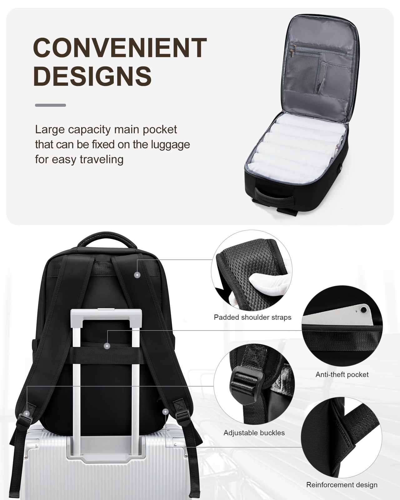 This backpack is a game-changer for travel! Spacious with smart compartments, it easily fits clothes, a laptop, and essentials. The USB charging port is super handy, and the waterproof design keeps everything safe. Super comfortable to carry—perfect for work trips or weekend getaways. Love the sleek black look too!