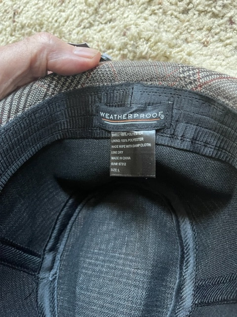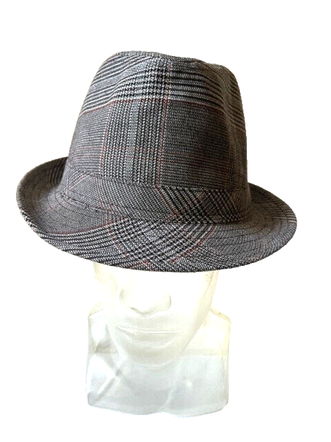 New with tags Dress hat Weatherproof 1 3/4 inch brim fedora, brown/grey/rust plaid lightweight fabric grosgrain inside sweatband; self outside band Size large is hat size 7 1/4, 59.5 cm material is a woven, 100% polyester shipped in a box #9
