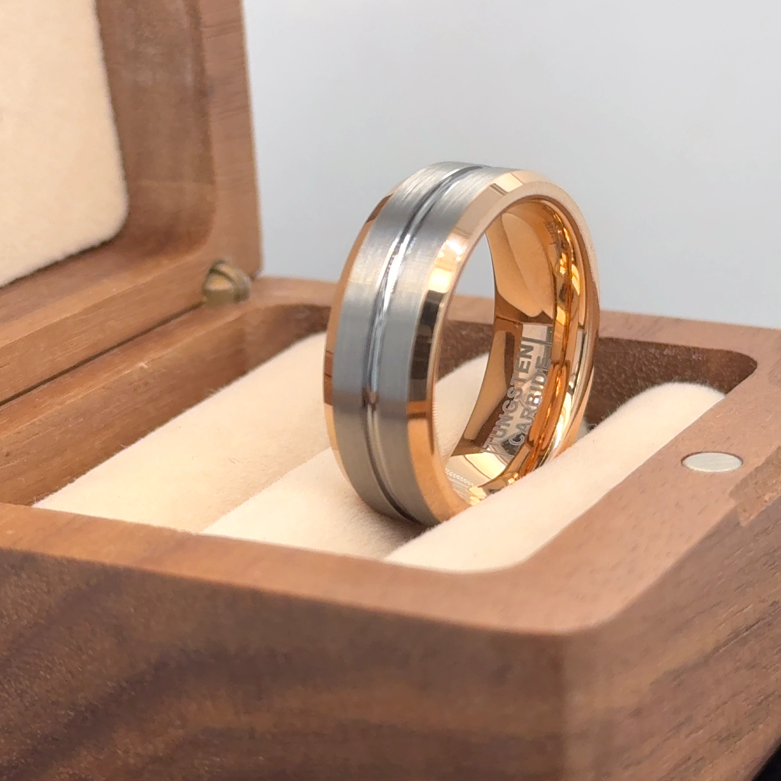 Rose Gold Tungsten Wedding Band Men's Wedding Ring grooved Brush Tungsten Ring ✅ Free Engraving 🎁 Order comes in gift box! ✅ Available Ring Sizes: 7, 7.5, 8, 8.5, 9, 9.5, 10, 10.5, 11, 11.5, 12, 12.5, 13, 14, 15 US ✅ Width: 8MM ✅ Metal: Tungsten Carbide ✅ Comfort Fit For engraving font style please see image in listing and mention font you want to engrave while placing order. ---All Laser Engraved Orders cannot be exchanged or returned.--- If you are not satisfied with your purchase from us you may return the item within 30 days with a full refund. This policy does not apply to all custom engraved items. Thank You Thank You