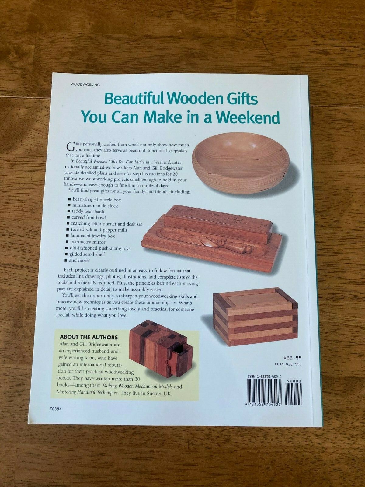 Dewey Edition:21Book Title:Beautiful Wooden Gifts You Can Make in a WeekendFormat:Trade PaperbackDewey Decimal:684/.08Author:Gill Bridgewater, Alan BridgewaterISBN-10:1558704523Item Height:0.4 inNumber of Pages:128 PagesISBN-13:9781558704527brand:F&W Media, IncorporatedGenre:House & Home, Social Science, Crafts & HobbiesSynopsis:Woodworkers will be happily challenged by 20 different projects, each of which are clearly presented in an easy-to-follow format that includes line drawings, photos, illustrations and complete list of tools and materials required.'LC Classification Number:TT180.B75 1998Publisher:F&W Media, IncorporatedItem Length:11 inItem Weight:19.1 OzLanguage:EnglishItem Width:8.5 inLCCN:97-034530Intended Audience:Tradegtin13:9781558704527Illustrator:YesTopic:Woodwork, Decorating, General, Customs & TraditionsPublication Year:1998