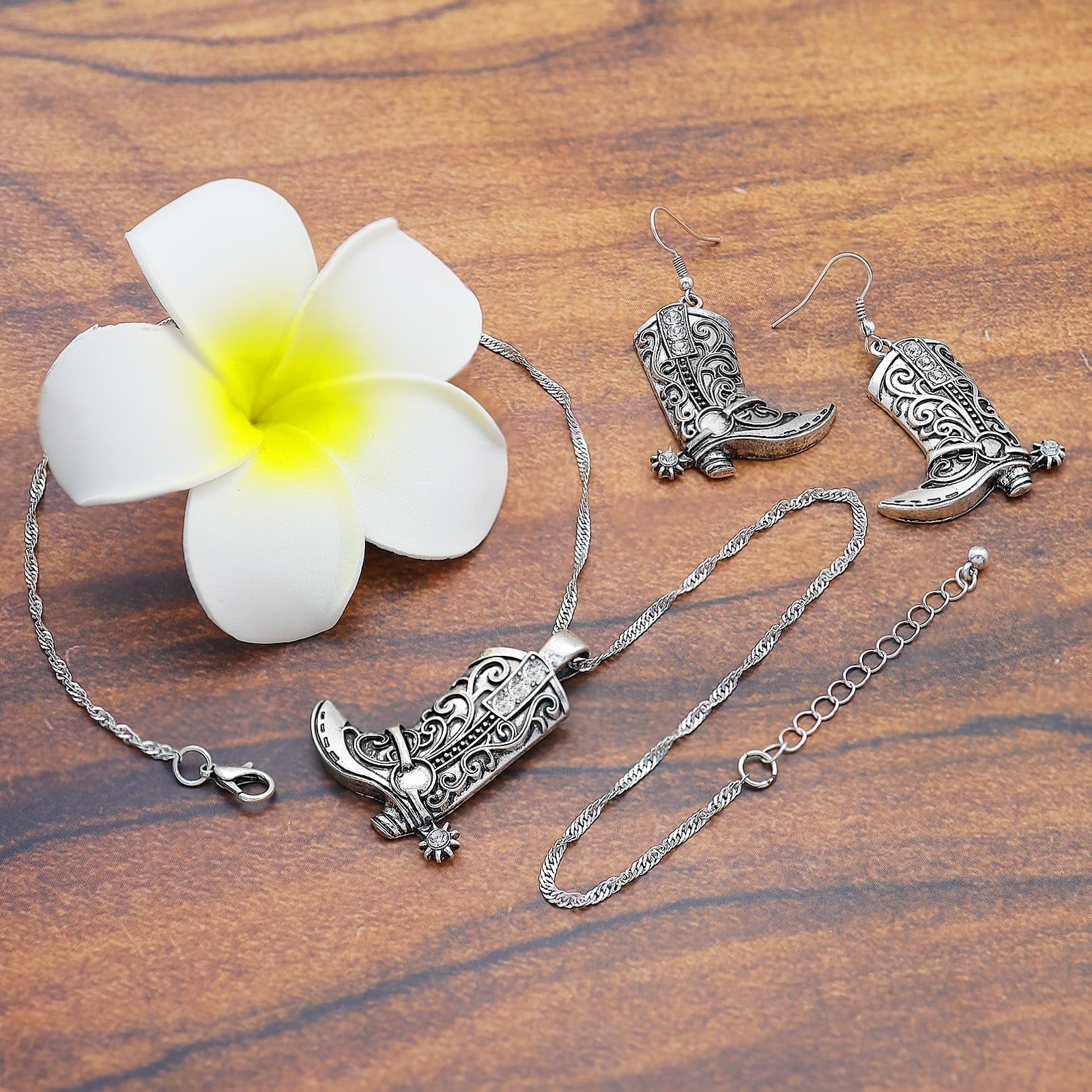 RechicGu Western West Cowgirl Cowboy Texas Boots Earrings Necklace Set, Spur Rodeo Drop Dangle Boots Earrings,Twist Link Chain Necklace with Boot Pendant,Jewelry Set Product Details Color: Boots Vintage Silver Set Brand: RechicGu MPN: Does not apply UPC: Does not apply EAN: Does not apply Department : womens Date First Available : March 18, 2024 Brand, Seller, or Collection Name: RechicGu Metal: alloy Material: Metal Gem Type: No Gemstone Chain: Twist Link Clasp: Lobster Clasp