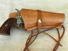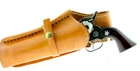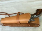 Leather Gun Holster - Right handed, Tan, Smooth leather 45 cal Large Holster Made in Mexico Genuine Quality Leather Hand dyed and dutifully crafted with pride using premium tanned smooth leather Design ed for large revolvers and a safe bet for any gun ten (10) inches or more in length Dimensions Overall length from end to end is eleven (11) inches Width at widest point is four (4) inches Circumference at widest point is eleven (11) inches Opening for belt is generally three (3) inches but there is margin for smaller or larger belts. Holster easily slides right onto the belt of your choice. Made of Genuine Leather with Leather Leg Strap and Leather Hammer Strap – this holster is not ma de out of fake man made materials. It is the real deal! Hecho en Mexico Holster Heavy Leather. Made of sturdy heavy-duty cowhide . Gun shown is for illustrative purposes and is not included in sale