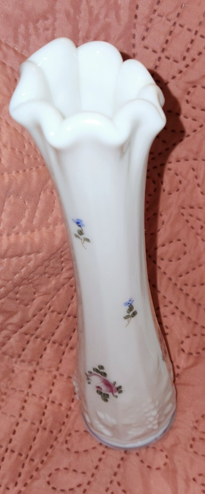 This beautiful Westmoreland vase is a must-have for any Westmoreland collector. The white milk glass vase in the paneled grape pattern features a hand painted rose design, decoration #32, roses and bows, making it a perfect addition to any home decor. The vase is 9 1/2" tall and has a swung, flat design, with an impressed backstamp on the bottom. This vase is perfect for displaying your favorite flowers and adding a touch of elegance to any room. The vase has the Westmoreland sticker on the neck of the vase.