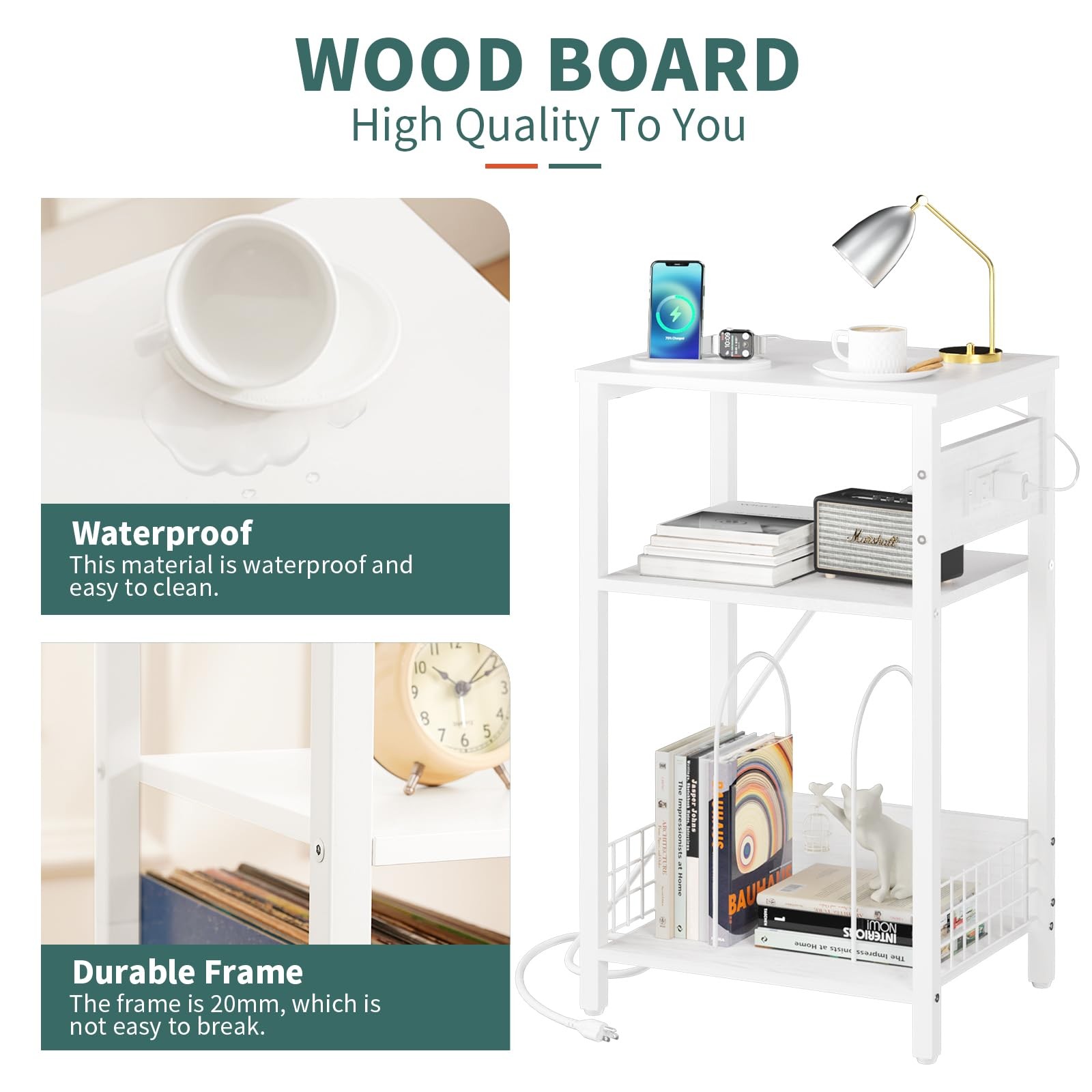 Experience unparalleled versatility with our bed side table. The tabletop and second shelf are large enough to hold a variety of record players and audio essentials. The brown side table features U-shaped shelves on third shelf for easy access and sorting of vinyl records. In addition, the small bedside tables have been upgraded with side wire mesh to prevent accidental slips. The nightstand with charging station is a game changer. With 2 USB ports and 2 outlets, the night table effortlessly connects to your record player, speakers, or other devices without a mess of cables. No more struggling to find a power source. Plus, the small table stand is lightweight and easy to move around. The brown end table is made of sturdy frame and wood planks for strong, long-lasting support: 100 lbs. for the hard top and 50 lbs. for the second/third shelf. Adjustable table legs level for added stability. Small side table for small spaces, the side table with storage features an airy/compact design that blends seamlessly into tight spaces. Unleash unrivaled versatility with our tall side table. Thanks to the removable U-shelf, the living room side tables offer even more possibilities for books, magazines, photo albums or cute trinkets. Not only is it a record rack with vinyl storage, but it can also be used as a living room end tables, end tables bedroom, office side table or decorative shelf to brighten up your decor. The tall end table comes with detailed instructions, labeled parts, assembly tools and corresponding assembly video for quick assembly. Always by Your Side. Overall Size:15.35"L × 11.81"W ×26.14"H. The 3rd Open Shelf Size: 11.22"W×14.17"H, designed for all kinds of vinyl(7/8/10/12 inch) 3 Tier End Tables: Elevate your audio journey with the 3 tier record player stand with vinyl storage. The tabletop and 2nd shelf are ample to hold various record players and audio essentials. And the 3rd open shelf features U shape rack for easy access and sorting of vinyl records. Plus, the bedside table is upgraded with side wire mesh to avoid vinyl accident slips End Table with Charging Station: The charging vinyl record storage are game-changers. With 2 USB ports and 2 outlets, the small side table can effortlessly connect your record player, speakers, stereo, or other devices without cables chaos. No more struggling with power supply searching. Moreover, it is lightweight to move with ease Versatile Side Tables: Experience unrivaled versatility with our small nightstand. Thanks to the removable U shape rack, it unlocks more storage possibilities for books, magazines, albums or cute trinkets. More than a small table, it also serves as bedroom night stands, side tables living room, small office table or decorative stand to brighten your decor Sturdy & Space Saving: Crafted from sturdy frame and wood board, the side tables bedroom boasts stalwart & lasting support: 100lbs for hard top and 50lbs for 2nd/3rd shelf. Adjustable feet can level to add extra stability. With airy/compact design, the end tables living room seamlessly blends into small space. Let the music flow freely without space constraints