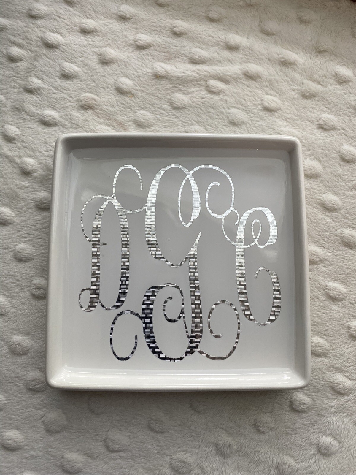 4.5” White Porcelain Ceramic Glass Ring Dish Tray. Choice of FREE design, 1 name or 3 letter monogram. Specify in comments when you pay your choice of design and vinyl color. Vinyl lettering - specify color preference. Hand wash.