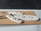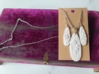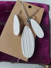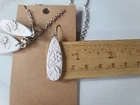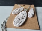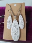 This is a new silver tone metal and white polymer clay floral jewelry set. Weighs: 10 grams with stock card Earrings measure 1 13/16" tall and 7/16" wide Necklace measures 21.5" long Pendant measures 2 1/8" tall with bale and .75" wide. All measurements are approximate. Condition: New condition. Please see photos. Sold as is. Priced accordingly. Please look over carefully and inspect any and all photos. Our shop is committed to fully disclosing all items' conditions and history with as great of detail as possible. Your jewelry will be packaged in a kraft gift box. Some pictures are enlarged to show detail. Does not include any props in photos. Please feel free to contact me with any questions you may have. Thank you for shopping. Secretary Drawer NOV24..