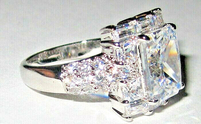 White Gold Silver Emerald Cut CZ Ring Clear White Square Celebrity Style Sizes 6-10