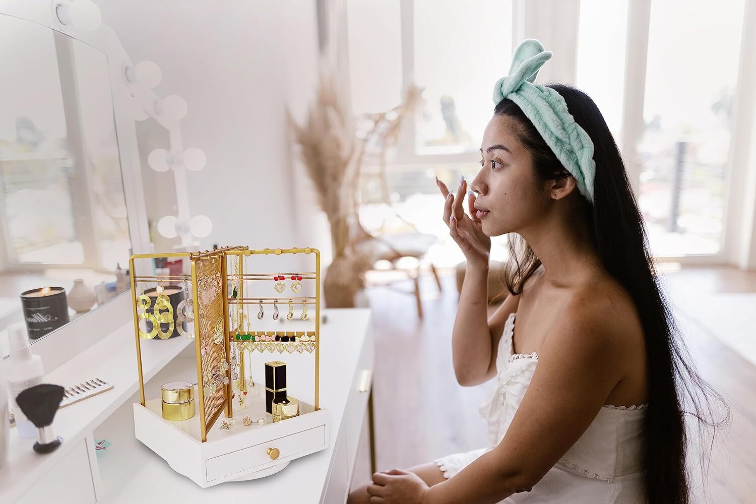 This jewelry organizer is a game-changer! The sleek white tree design looks elegant on any dresser, and the rotating base makes it easy to find my favorite pieces. It holds all my necklaces, earrings, and bracelets without tangling—perfect for keeping everything visible and organized. The wood and metal construction feels sturdy, and it makes a beautiful gift for any occasion. Love how it saves space while adding a modern touch to my room!