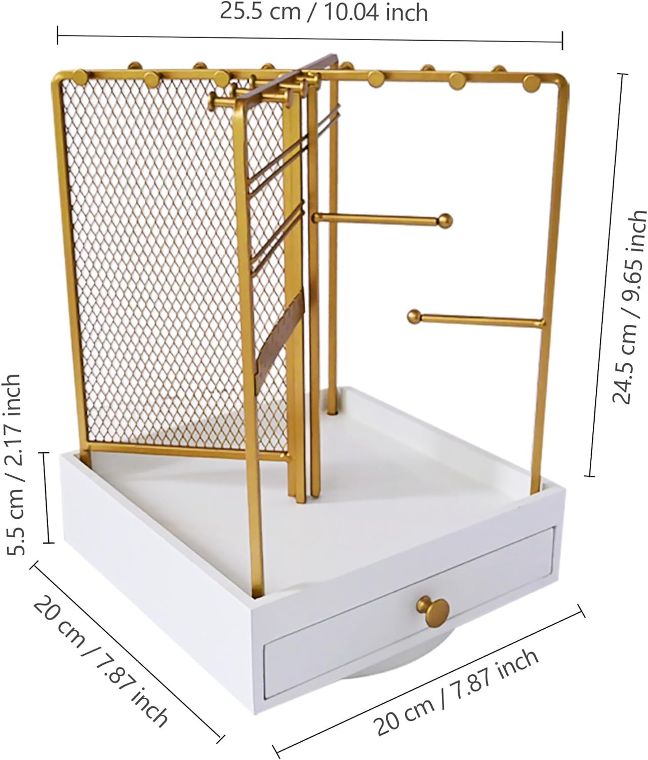 Jewelry Organizer Stand, Display Earring Tree, Necklace white-7.87" width Product Details Color: white-7.87" width Brand: wisnew Material: Wood, Metal Style: Modern Special Feature: Rotatable Recommended Uses For Product: Necklace, jewelry shop display, Bracelet, Ring, Watch, Earring, Bangle Product Dimensions: 7.87"D x 7.87"W x 12.41"H Target Audience: Women, mother, girlfriend, wife, Girls,daughter Shape: Tree Occasion: Mother's Day, Christmas, Birthday, Thanksgiving, Valentine's Day Mounting Type: Table Top Inner Material: wooden and metal Number of Drawers: 1 Number of Compartments: 1 Jewelry Storage Type: Jewelry Stand Number of Items: 1 Manufacturer: wisnew Part Number: White rotating white jewellery stand Item Weight: 3.5 pounds Country of Origin: China Item model number: White rotating white jewellery stand Item Package Quantity: 1 Special Features: Rotatable Included Components: 360 rotation jewelry tray, wooden drawers, metal jewelry hanging Batteries Included?: No Batteries Required?: No Color: white-7.87" width Brand: wisnew Material: Wood, Metal Style: Modern Special Feature: Rotatable Recommended Uses For Product: Necklace, jewelry shop display, Bracelet, Ring, Watch, Earring, Bangle Product Dimensions: 7.87"D x 7.87"W x 12.41"H Target Audience: Women, mother, girlfriend, wife, Girls,daughter Shape: Tree Occasion: Mother's Day, Christmas, Birthday, Thanksgiving, Valentine's Day 【Convenient Rotating Display Stand for Jewelry】360° rotation for easy access to earrings, necklaces, bracelets, and rings. 【Space-Saving Earring and Necklace Organizer with Large Capacity】This 4-sided metal jewelry rack design keeps all your jewelry neatly organized, preventing loss and maximizing space. 【Easy Assembly Jewelry Towers】Simply assemble the wooden drawers and two metal jewelry hangers within minutes. 【Durable and Stable Jewelry Holder】 The thickened wooden drawer and heavy duty metal jewelry hanger provide exceptional stability, even when holding heavier jewelry pieces. 【Perfect Gift Idea】 Impress your loved ones with organized and accessible jewelry display, suitable for any occasion like Valentine's Day, Mother's Day and Christmas Day. Captivates her, makes her feel special. Don't miss out!