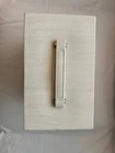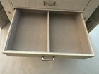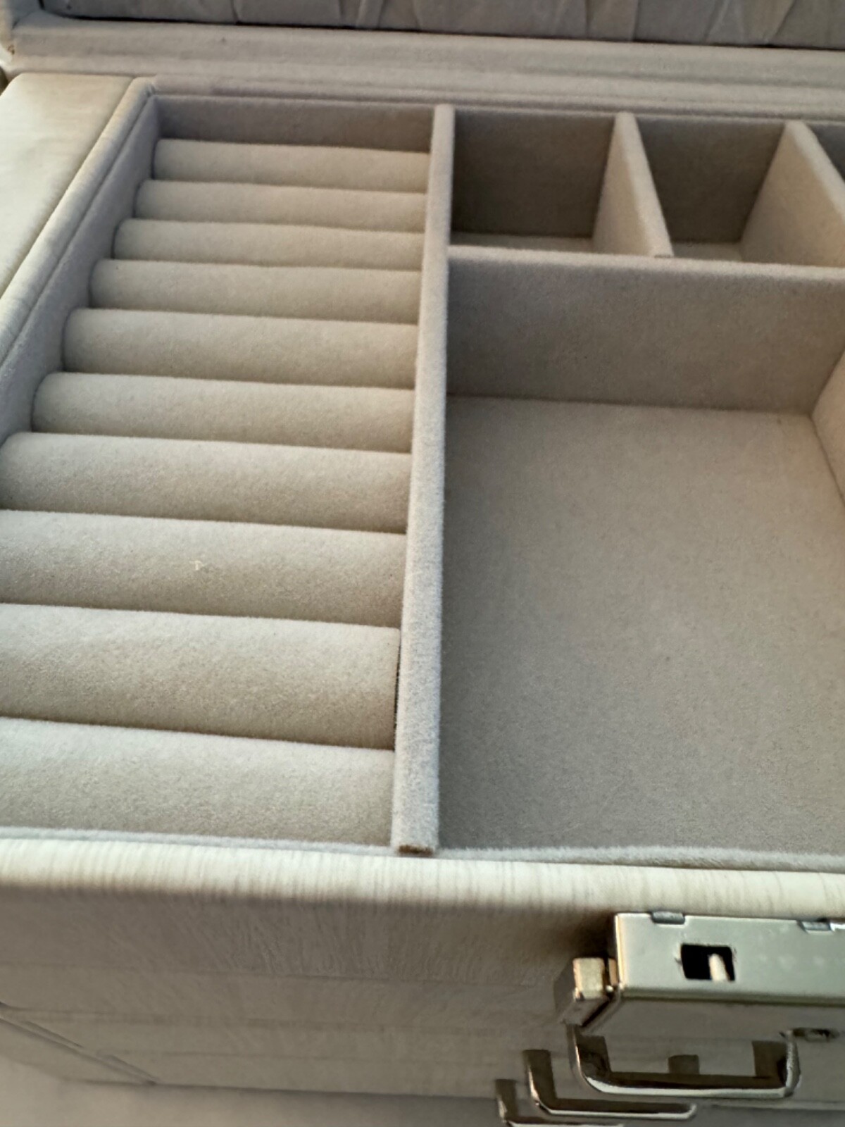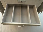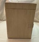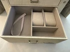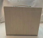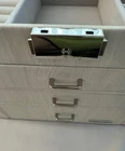 NEW NEVER USED - Top lifts up to reveal a space for rings, earrings, and 3 small compartments. 1st drawer has 4 long compartments. 2nd drawer has two large compartments.1st and 2nd drawers are both 1.25" deep. Bottom drawer is 2.25" deep for bigger jewelry items. Both sides snap shut but open reveal hooks to hang more jewelry and small pockets. Inside the lid is another pocket and a small mirror. This jewelry box has a lock and key. Measures 10" l x 8.5" high x 6 1/8" wide.