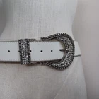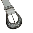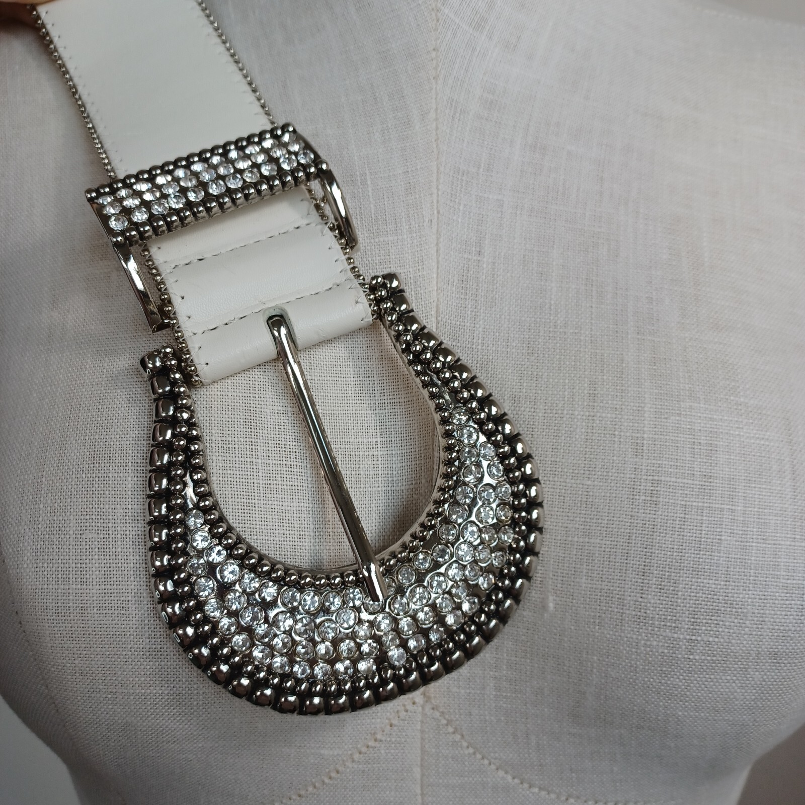 This belt is absolutely stunning! The white leather is clean and soft, and the rhinestone horseshoe buckle adds the perfect blingy western touch. It's well-made, fits true to size, and looks even better in person. Great condition for pre-owned—no flaws at all. Love how it dresses up jeans or adds flair to a cute dress. Super happy with this purchase!