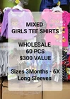 Wholesale Lot of 60 PCS of Girls Long Sleeves Tee Shirt Lot Includes: 60 PCS of Tee Shirts all long sleeve tee shirts mix of colors and sizes Character, Graphic, Solid, & Pattern Tees Lot includes a variety of Sizes 3 Months to 6 (MAY OR MAY NOT INCLUDE ALL THE SIZES) May include similar, repeated and duplicate items Pictures shown are a sample of the lot This lot is great for reseller, flea market, swab meet, ecommerce retail, donations, etc.. These tee shirts are clearance items and are all new with tags. Please feel free to contact us with any questions you might have.