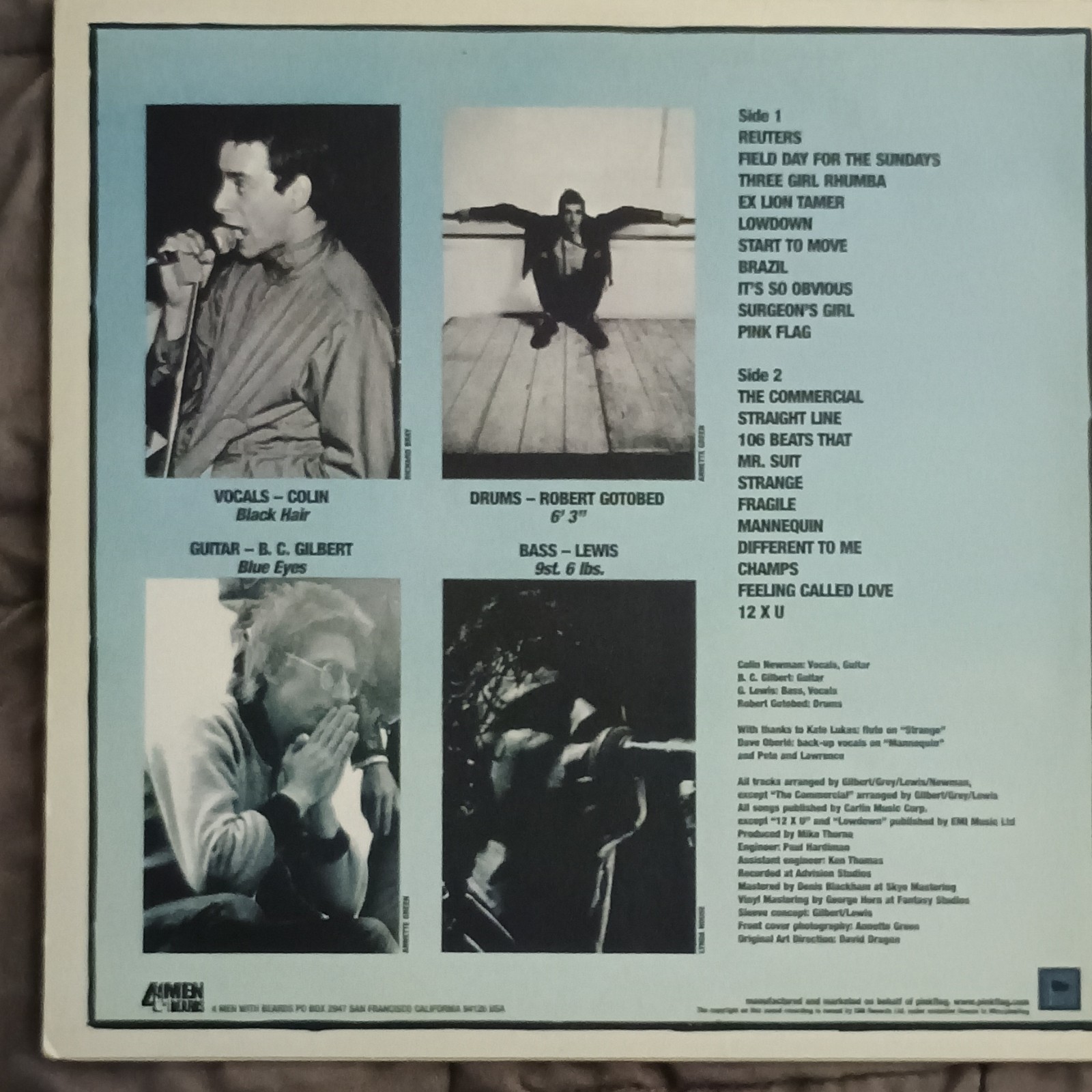 Record Label:4 Men With BeardsRelease Title:Pink FlagSpeed:33 RPMType:LPComposer:Newman, Gilbert, LewisColor:BlackGenre:Rock, PunkStyle:Punk/New WaveCase Type:Cardboard SleeveEra:1970sFormat:RecordRecord Size:12"Artist:WireMaterial:Vinyl
