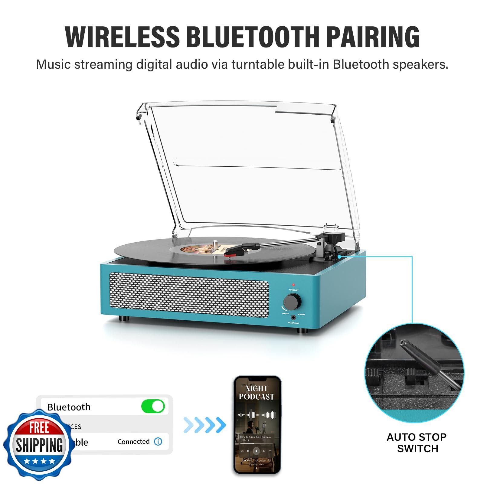 Record Player Wireless Bluetooth Turntable with Speakers for Vinyl Records Belt-Driven Vintage Turntable Support 3-Speed, Headphone, RCA Line, AUX-in for LP Players Home Decoration Blue Features 【Retro-looking Record Player】Feel the warmth of time and the charm of music with this vintage-inspired record player, a perfect blend of retro and modern style. Ideal for music lovers of all ages, this record player is the perfect gift for your beloved family and friends on any festival. 【Wireless Bluetooth Record Player】Step into a world of musical freedom with our wireless Bluetooth record player. Embrace the convenience of streaming your favorite tunes from your phone or tablet, say goodbye to tangled wires and hello to seamless, high-quality sound with a touch of retro charm. 【Built-in Speaker Record Player】No need for extra speakers, build in dynamic full-range stereo speaker, simply connect to external powered speakers via the RCA output for enhanced sound quality. Enjoy music playback through AUX or Bluetooth, offering versatility for your listening preferences. 【3-speed & 3-size Turntable】Experience balanced tonearm with adjustable lifting arm control, supporting playback at 3 speeds (33-1/3, 45, and 78 RPM) and accommodating 3 record sizes (7'', 10'', and 12''). Enjoy every piece of your record collection with ease and precision.TIPS:When placing a 12-inch vinyl record on the turntable, gently tilt it toward the tonearm to ensure proper playback. 【Belt-driven Anti-vibration Turntable】Our turntable base adopts spring and belt-drive design to provide excellent shock absorption and optimize sound quality, bringing you a real and rich audio experience. The transparent dust cover is easy to remove, which can effectively protect your precious vinyl record collection, allowing you to immerse yourself in the pure vinyl nostalgic music. Shipping Free & Fast Shipping: We offer free shipping to most of the USA with a normal delivery time of 3-7 days. However, due to the current situation, additional delivery time (up to 3 weeks) may be required for some items. Alternative Carriers: We may use alternative carriers (e.g., USPS, FedEx, UPS) to ensure your package arrives safely and on time. Due to the use of multiple carriers, we are unable to provide a tracking number automatically. Handling Time: Orders are processed and shipped within 1-2 business days of receiving cleared payment. Shipping Restrictions: Shipping to Alaska, Hawaii, Puerto Rico, Guam, and other US territories may incur shipping charges or delivery restrictions. Please contact us before ordering, or your order can be refunded/cancelled. State Restrictions: Certain items may not be shipped to California due to state regulations. Contact for Tracking Updates: If you require tracking updates or have any concerns about the delivery of your order, please feel free to contact us, and we will be happy to assist you. Return Policy 30-Day Hassle-Free Returns: If you are not completely satisfied with your purchase, you can return the item for free within 30 days of receiving it for a full refund or exchange. Easy Return Process: Contact us, and we will provide you with a prepaid return shipping label and detailed instructions. No Restocking Fee: There are no restocking fees for returns. However, the buyer is responsible for return shipping costs if the return is not due to a seller"s error. Refund Processing: Refunds will be processed within 1 business day of receiving the returned item in its original condition. Feedback Your feedback is extremely important to us. We strive to provide the best products and customer service possible. If you are satisfied with your purchase, please take a moment to leave us a positive review. If you have any concerns or issues with your order, please contact us before leaving negative feedback. We are committed to resolving any problems and ensuring your satisfaction. Contact Us If you have any questions or concerns, please feel free to reach out to our customer support team. You can contact us through the eBay messaging system. We are available Monday to Friday, 9:00 am to 5:00 pm EST, and we will do our best to respond to your inquiry within 24 hours. Thank you for supporting our small family business!