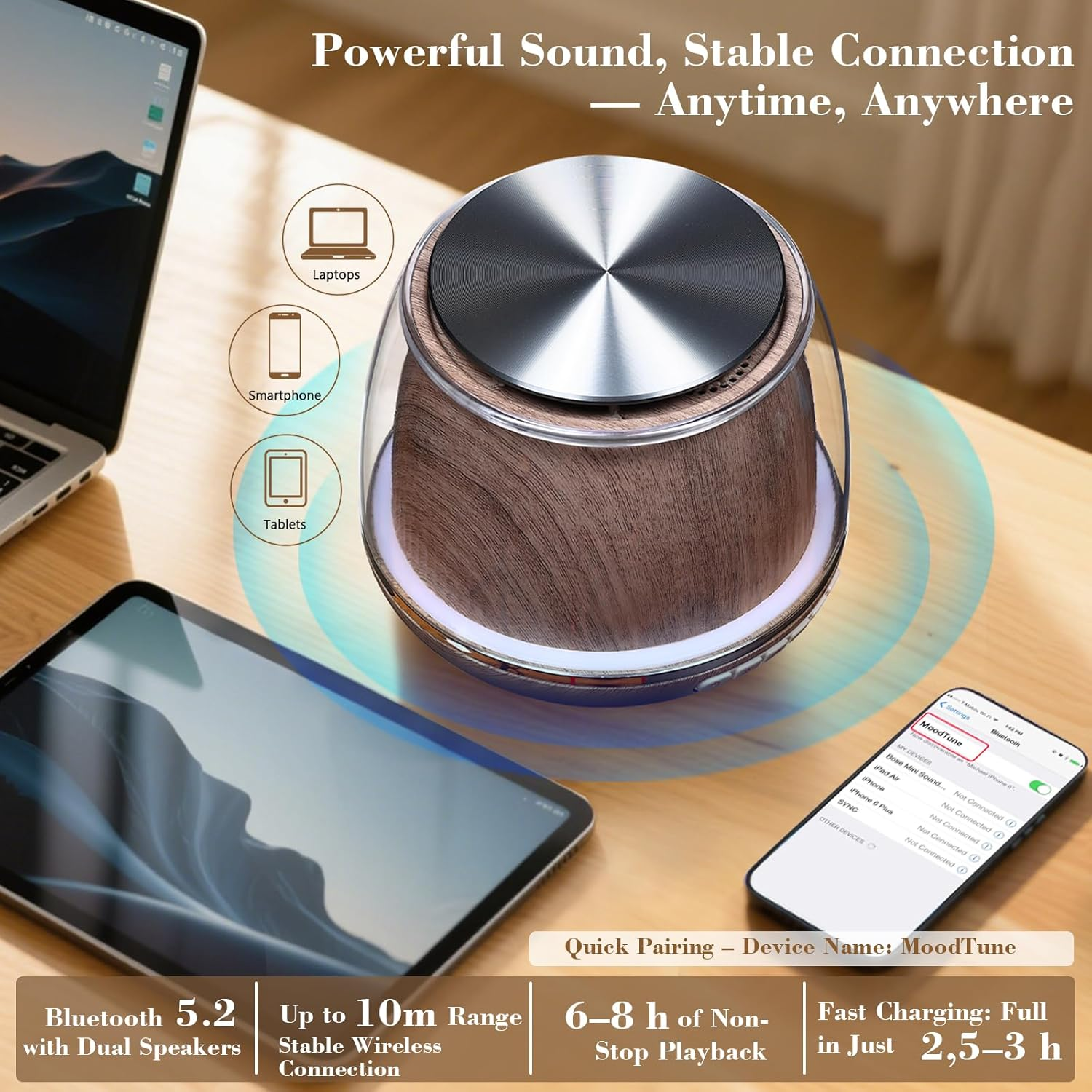 This Bluetooth speaker is a game-changer! The 360° rotating design and vibrant RGB lights create a fun, dynamic vibe while delivering rich, high-fidelity sound with deep bass. Bluetooth 5.2 ensures a rock-solid connection up to 10 meters, and the 2600mAh battery keeps the party going for hours. Perfect for music, movies, or as a cool display stand—love the immersive audio and stylish look!