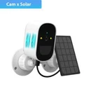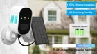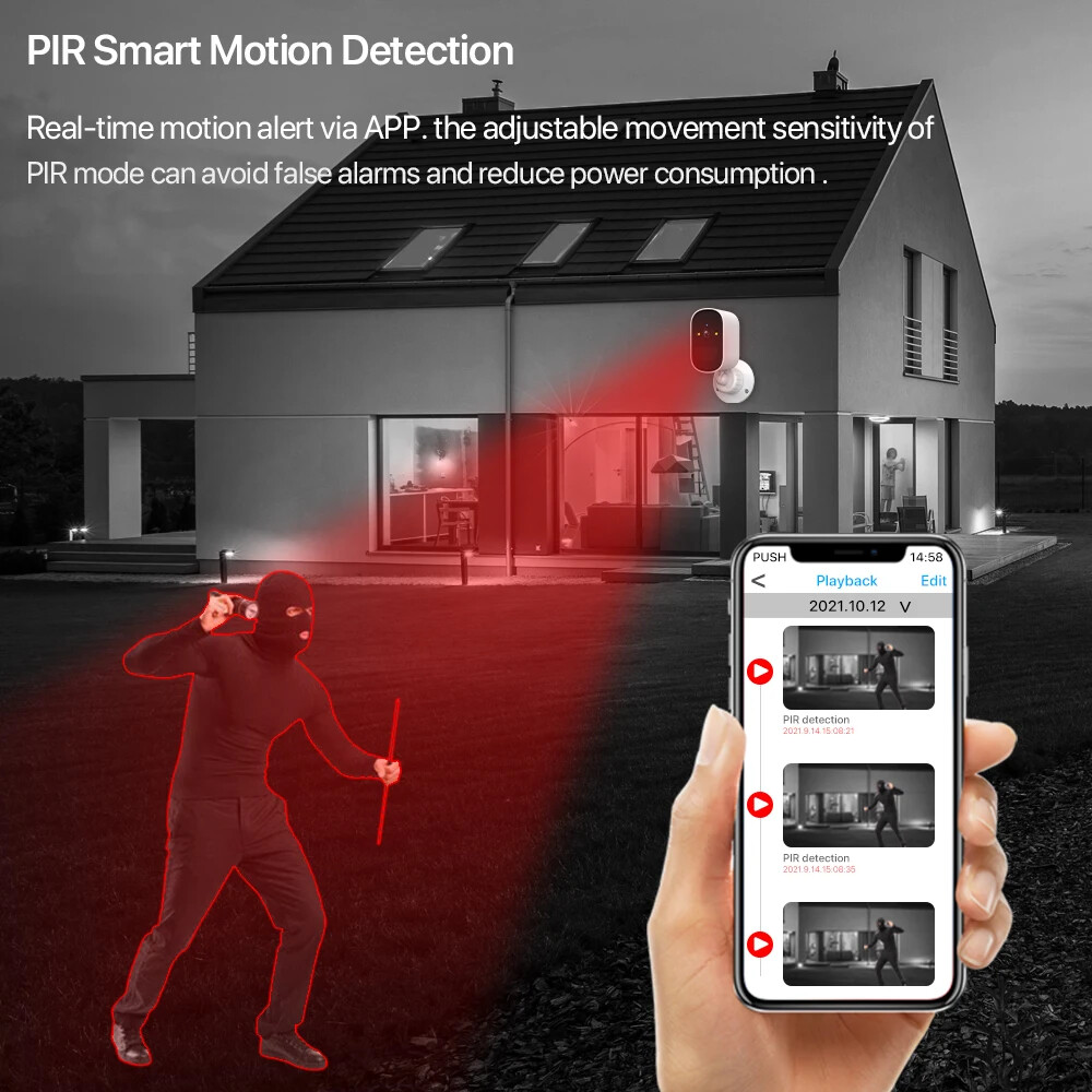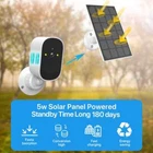 FAQ Q: Is the battery rechargeable? Do I need to connect a power adapter to the camera? A: YES, the battery is rechargeable. And you do not need use power adapter to power on the camera. Q: Is there power adapter in the accessory? A: NO. But it comes with the power cable for universal 5V 2A power adapter. Q: How long does the battery last when in full charge? A: The battery will work about 180 days time(Time working time needs to be calculated based on the trigger time). by sensor triggered, remote view and remote playback. (PS: Recording can only be done in the micro SD Card by sensor triggering). No wiring required,Put it everywhere you want 100% wireless connection via WiFi, no power cord, no drilling, and no sockets. Based on 2.4 GHz WiFi, it can work independently and can be placed anywhere. 5W Solor Powered - Solar panel can cycle to save the battery power to the battery camera, which is more energy efficient and convenient to save electricity. Infrared night vision See what is happening in the darkness,with enhanced night vision, and makes your life safer. 1080P HD image quality Maximize the protection of your family and watch every detail o clearer videos and pictures ,with 1080P resolution(1920*1080). PIR Smart Motion Detection Real-time motion alert via APP. the adjustable movement sensitivity of PIR mode can avoid false alarms and reduce power consumption . What will be detected with PIR? The PIR function only triggers an alarm for people or larger animals and will reduce false alarms Battery With 1.36W Solar Powered One day of sunshine keeps the camera running for sveraldays Achieved through 2ps 18650 batteries(option),1.36W solar panels and smart standby mode Solid and reliable The Battery WiFI camera with high-quality engineering IP66 material and solid construction can survive various of harsh environment. Working temperature -20°~ 50° makes it work both inside and outside Continous recording Continous recording to help you always be with the people and things you care about. What to do with too many valuable videos Support Cloud Storage(cloud need pay money)Insert a TF card up to 64GB (TF can be selected as needed) helps you save the video you are not willing to delete Clear Two-Way Audio & Audio Record Record important sound evidence of true reproduction and talk with the visitors freely through built-in Microphone & speaker. Multi-User View Access & The camera can be used indoors and outdoors It's interesting to share good scenes with family and friends in real time, multiple users' function can fulfill 3-4 users to watch videos online at the same time Get Remote Access Anywhere Anytime It’s possible to watch surveillance video in real time like on travel and on business or at work Multi-User View Access It's interesting to share good scenes with family and friends in real time, multiple users' function can fulfill 3-4 users to watch videos online at the same time Main features: -Solar Outdoor WiFi Camera,Waterproof IP66 -High Resolution 2.0MP/1080P CMOS Sensor -Lens: 4mm Fixed Lens (110 Degrees) -Array Leds Supplement Light(Support IR Night Vision), 10M Night Vision -Built-in Microphone,Support Two Way Audio Talk Back(Built-in Speaker) -WIFI Cam Protocols : 802.11b/g/n, 150Mbps, 10-30m -Support Iphone, Android Smart phone