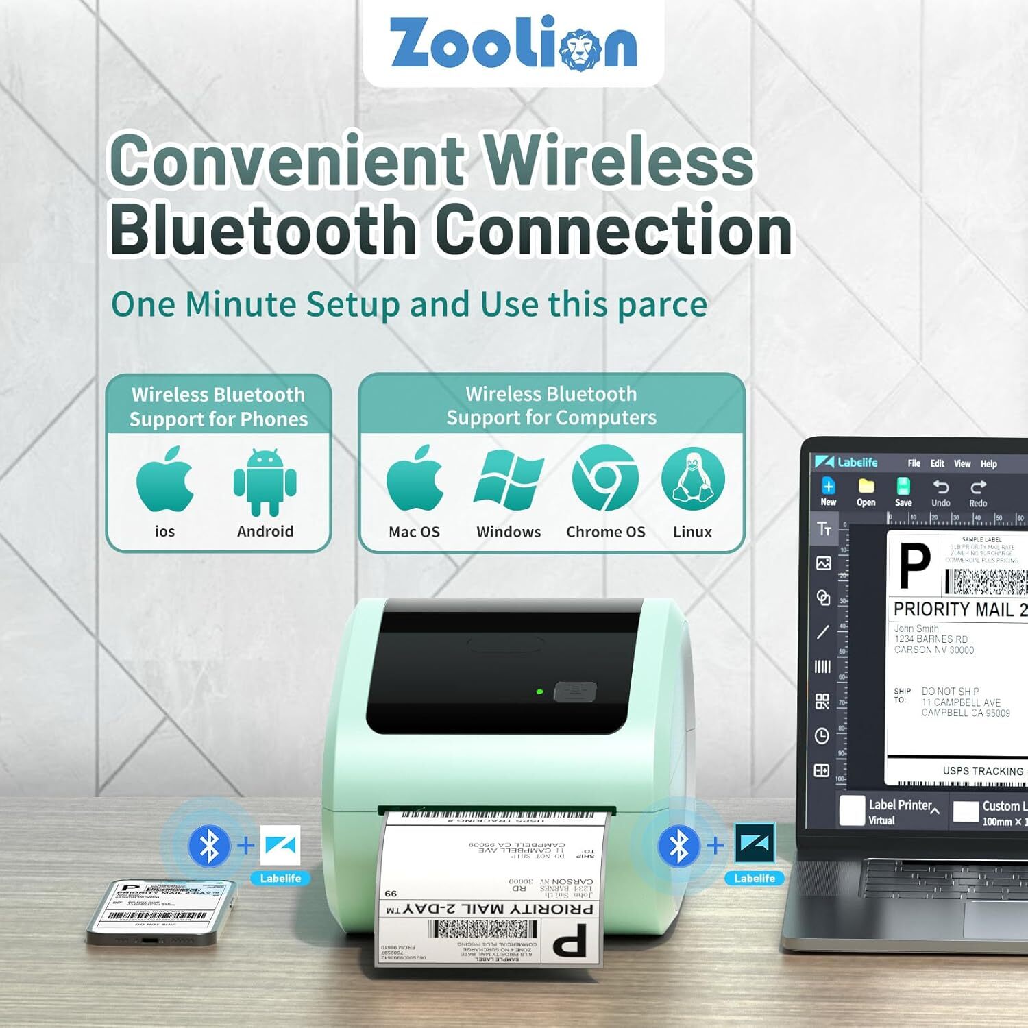 About this item 4x6 Shipping Labels Thermal Printer: This 4x6 label printer supports iPhone, iPad, Android, MAC, and Windows. You can print via the app "Labelife" for your iPhone, iPad, MAC, Android, and Windows, making it convenient and easy to use (Note: Please ensure your PC has Bluetooth functionality and is operating normally). USB Thermal Printer: This thermal label printer supports MAC, Windows, Chrome OS, and Linux systems through USB connection. Before installation, ensure the label printer is connected and turned on. If you encounter "The application can't be opened" when installing the MAC driver, go to "System Settings" - "Privacy & Security", scroll down, and click "Open Anyway". Wireless Label Printer for Small Business: This printer is fast and clear. This inkless printer can print up to 72 labels per minute at a speed of 150 mm/s, improving efficiency and saving time. The 203 dpi resolution ensures barcode scanning is easy and accurate. The paper bin design makes thermal labels easy to organize and store, and the built-in holder is jam-resistant and supports both rolled and folded paper. Works with Any Thermal Shipping Labels: This mailing label printer can print any direct thermal label width between 0.4" (11mm) to 4.6" (118mm), with a maximum print width of 4.25" (108mm). It supports printing of 4x6" shipping labels, warehouse labels, barcode and ID labels, package labels, mailing labels, and more. Circle label printing is also supported. Strong Platform Compatibility: This 4x6 thermal printer for shipping labels works with sales and e-commerce platforms including Amazon, eBay, Shopify, USPS, UPS, Etsy, PayPal, Poshmark, and Post, etc. (Note: Please download the label to be printed on the corresponding platform before printing, then upload it to the editor app "Labelife" for printing). About the App "Labelife": The app is free label editing software that provides label templates for personal, commercial, industrial, office, and other fields, making setup easy! Product dimensions: 9"D x 6.89"W x 6.26"H