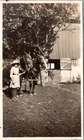Woman in Light Dress & Hat Standing Team of Horses Barn Yard Vintage Photo 16555 The image is a black-and-white photograph showing a person standing next to two horses. The person is wearing a dress and a hat, and is holding the reins of the horses. The horses are harnessed and appear to be ready for work or pulling a cart. In the background, there is a large tree and a building with a wooden door and a small window. The setting appears to be rural, possibly a farm. The photograph has an old-fashioned, vintage feel, suggesting it might have been taken many years ago. This image is interesting as it captures a moment in time, reflecting historical rural life and the relationship between humans and working animals.