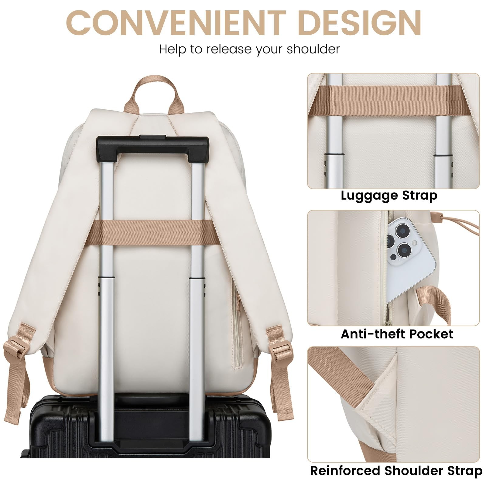 Specificities: 25L, Medium Size, 15.6 inch, 17.5 in x 12.5 in x 7 in Name: Adults Teen Kids Boys Girls Backpack Women School Bag Anti Theft College Laptop Leisure Water Wear Resistant Durable Sturdy office business work Back Pack Waterproof Student Bookbag Travel Daypack Stylish Fashion Large Capacity Middle High School College Bookbag Casual University Computer Book Bag Backpacks Multi Pockets with Laptop Compartment 【Large Capacity Backpack with Multi Pockets】This laptop backpack feature 4 compartments and 14 pockets, the main compartment fits for 15.6" computer or chromebook, binder, A4 folder, clothes, book, or other school essentials. The organized middle compartment for your pen, cell phone, iPad, notebook, etc. And the large front zip pockect is ideal for charger, wallet, tissue, notepad or other items that need to be accessed frequently. 2 side pockets can hold 32oz water bottle or umbrella easily 【Comfortable & Breathable Bookbag】 Designed for long-lasting comfort, this women college backpack features sturdy, adjustable shoulder straps made of breathable mesh to keep you cool and supported throughout the day. The school bag measures 17.3" x 12.5" x 7" and weighs only 1.76 lbs, making it lightweight yet spacious. Inside, a mesh pocket offers excellent visibility and airflow—ideal for organizing accessories while preventing scratches on delicate items like electronics or sunglasses 【Secure & Convenient Design】 Our girls travel back pack designed with safety and convenience, this students bookbags features a luggage strap to easily attach to suitcases, making travel hands-free. A back anti-theft pocket keeps your passport or phone safe and within easy reach. The top handle offers extra convenience when lifting or hanging. The inside velcro strap keeps your device stable and protected. In front, an elastic drawstring stores items such as hats or sports protective gear 【Durable & Stylish Backpacks】 Built to handle daily adventures, this teens backpack is made of water-resistant, wear-resistant fabric that keeps your belongings protected in unpredictable weather. The premium zippers glide effortlessly, increasing the durability and user-friendly design of book bag. On the front panel, a sleek logo and a functional D-ring add both style and utility—perfect for attaching keys, charms, or small gear. (Diy Delicate DoIl not included). Age Range: over 3 years old 【Versatile Use & Perfect Gift Choice】 LIVUWERK backpack is thoughtfully designed for women, teens, and girls—perfect for middle/high school, college, work, travel, or everyday use. The modern design and functional features of this khaki beige bookbag make it a wonderful gift for your daughter, girlfriend, wife, or friend on occasions like birthdays, Christmas, Valentine’s Day, Mother’s Day, or the back-to-school season. And we provide reliable customer service and after-sales support