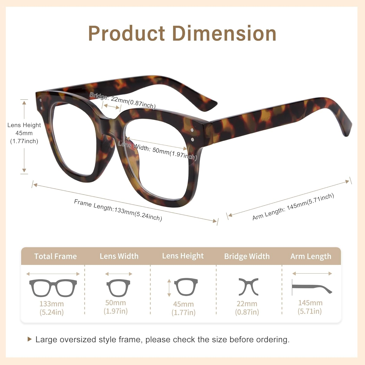 Business is our speciality NEW Women Blue Light Glasses,Oversize Blue Light Glasses for Women, anti Eyestrain & UV Protection Computer Eyeglasses Hanna (Tortoiseshell) FEATURES 【Large Blue Light Glasses】Unlike other blue light blocking glasses, our glasses can not only anti harmful blue light to reduce eyestrain/eye fatigue but also protect against UV rays, minimize headache and protect our eyesight. 【Sturdy Quality & Elegant Outlook】These wide rectangular premium frames with ultra-durable material for durability and comfortable. Based on the classic style which feature modern designs that offer clear vision and delight charm to daily wear. 【Product Dimension】 Lens width - 50mm,lens height - 45mm,temple length - 145mm,nose bridge - 22mm. Our chic oversized anti-blue light glasses boast a retro large frame design, so we suggest checking the size to ensure a perfect fit before ordering. 【Blue Light Blocker Lense】 Designed with innovative lens that filters out the harmful blue light/ UV rays. non-Prescription computer glasses passed CE certification. 【Gifted Package】 Each eyeglasses comes with a convenient glasses case,a micro fiber glasses cleaning cloth and a booklet.Exquisitely package making it an ideal gift for friends and family! Product Description 1 Appearance Detail 2 Structure Detail 3 Wearing Detail Item model number UKAU-0003-T Style Oversized Color Tortoiseshell Department womens Package Dimensions 6.26 x 2.48 x 1.02 inches; 1.06 ounces 2.48 inches x 6.26 inches x 1.02 inches. Weight: 1.06 oz Ask us anyhting Free shipping PAYMENT We accept all payments via Ebay using Credit Cards , PAYPAL , Apple Pay and many others SHIPPING We are always working hard to ensure your package arrives as soon as possible. Please understand that some factors like weather, high postal traffic, and the performance of shipping companies are outside of our control. DELIVERY & RETURN POLICY We offer a 30-Day Return Policy on items in which you are not completely satisfied with. You have the option of a full-refund or an exchange of the item. No returns are available on items shipped outside of the USA.