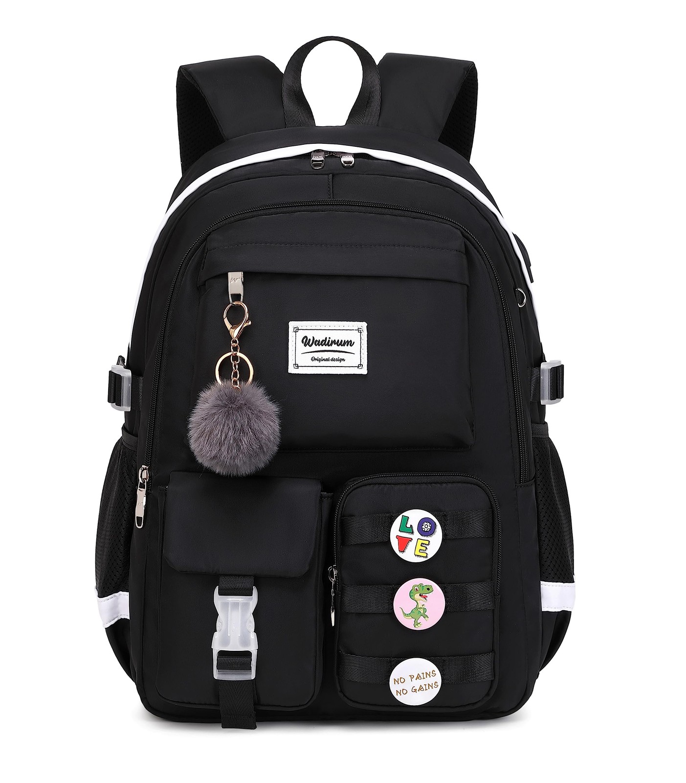 Made of high-quality waterproof polyester material, smooth and durable zipper and durable nylon lining. Zippered main compartment opens wide and flat for quick access to your gear. This backpack is durable and fashion. Organize study items or weekend accessories in this convenient backpack. One large main compartment offers ample room to fit clothes, towels, a laptop or books while a front utility pocket provides space for items such as pens, keys, pencils, and phone chargers. And two side pockets for a bottle, umbrella, or other items. Backpack size:12.2*6*18.5 inches (Length*width*height), weight:1.5LB. Interior laptop sleeve offers secure storage designed to fit most 15.6’’ laptops. Adjustable shoulder straps with mesh cushioning and fully padded back panel for personalized comfort. Featuring a pure color and fashion design, this student backpack adds classic style to your everyday look. This backpack is very suit for school routine, daily use or short trip. Three fashion front pockets for organizing easily for small items.Back have an luggage strap when your on travel can hang backpack on luggage box.