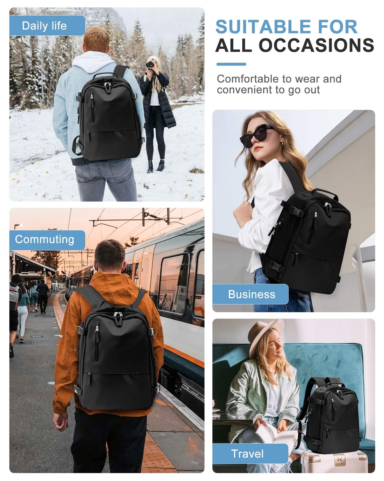 This backpack is a game-changer for travel and daily use! The USB charging port is super convenient, and the separate shoe compartment keeps everything organized. Lightweight yet spacious, it fits airline requirements and slides easily onto luggage. Perfect for laptops, tablets, and all your essentials—love the smart design!